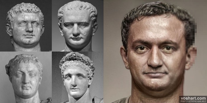 A photorealistic representation of what the Roman emperor Domitian (r. 81-96 CE) may have looked like. Pictured alongside the reconstruction are the artworks and statuary used as references. From left to right and top to bottom, these are the Vatican bust; Altes Museum Berlin bust; National Archaeological Museum of Venice bust; and the Louvre bust. Based on contemporary and near contemporary descriptions, as well as archaeological evidence. Made using Photoshop and Artbreeder, a neural net tool.