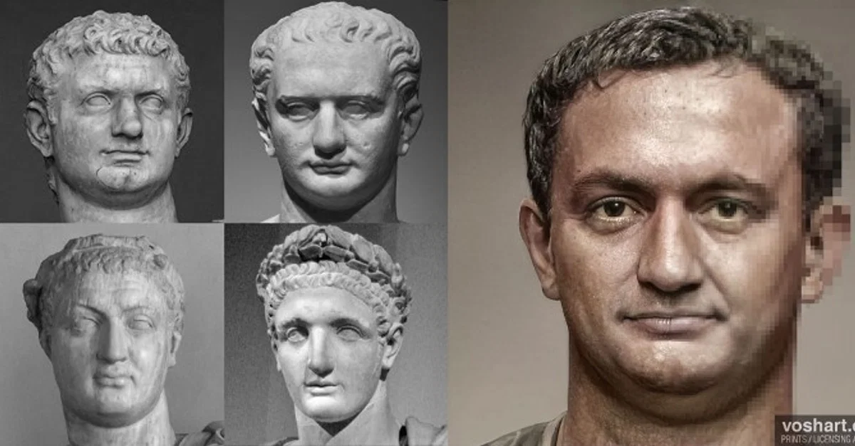 A photorealistic representation of what the Roman emperor Domitian (r. 81-96 CE) may have looked like. Pictured alongside the reconstruction are the artworks and statuary used as references. From left to right and top to bottom, these are the Vatican bust; Altes Museum Berlin bust; National Archaeological Museum of Venice bust; and the Louvre bust. Based on contemporary and near contemporary descriptions, as well as archaeological evidence. Made using Photoshop and Artbreeder, a neural net tool.