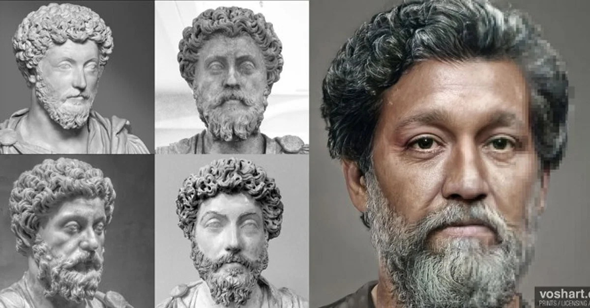 A photorealistic representation of what the Roman emperor Marcus Aurelius (r. 161-180 CE) may have looked like. Based on contemporary and near contemporary descriptions, as well as archaeological evidence. Pictured alongside the reconstruction are the busts and statuary used as references. These include busts from the Glyptothek (top left); Musée des Antiques de Toulouse (top right); Musée Saint-Raymond (bottom left); and the Metropolitan Museum of Art (bottom right).