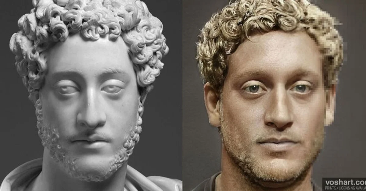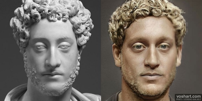 A photorealistic representation of what the Roman emperor Commodus (r. 180-192 CE) may have looked like. Based on contemporary and near contemporary descriptions, as well as archaeological evidence. Pictured alongside the reconstruction is the bust of Commodus from the J. Paul Getty Museum.