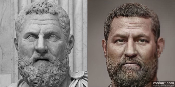 A photorealistic representation of what the Roman emperor Pertinax (r. 193 CE) may have looked like. Based on contemporary and near contemporary descriptions, as well as archaeological evidence. Pictured alongside the reconstruction is the bust of Pertinax from the Vatican Museum.