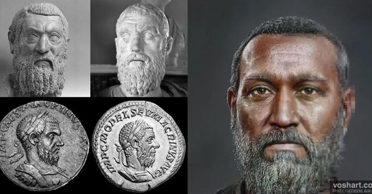 A photorealistic representation of what the Roman emperor Macrinus (r. 217-218 CE) may have looked like. Based on contemporary and near contemporary descriptions, as well as archaeological evidence. Pictured alongside the reconstruction are the busts and statuary used as references. These include busts from the Capitoline Museum (top left) and Belgrade City Museum (top right), and coin portraits from his reign. Made using Photoshop and Artbreeder, a neural net tool.