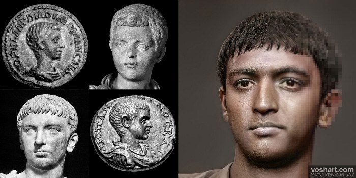 A photorealistic representation of what the Roman emperor Diadumenian (r. 217-218 CE) may have looked like. Based on contemporary and near contemporary descriptions, as well as archaeological evidence. Pictured alongside the reconstruction are some of the statuary and coin portraits used as references. Made using Photoshop and Artbreeder, a neural net tool.
