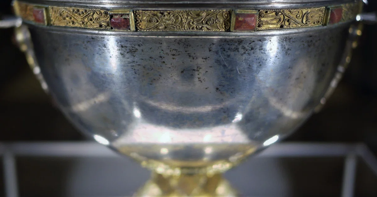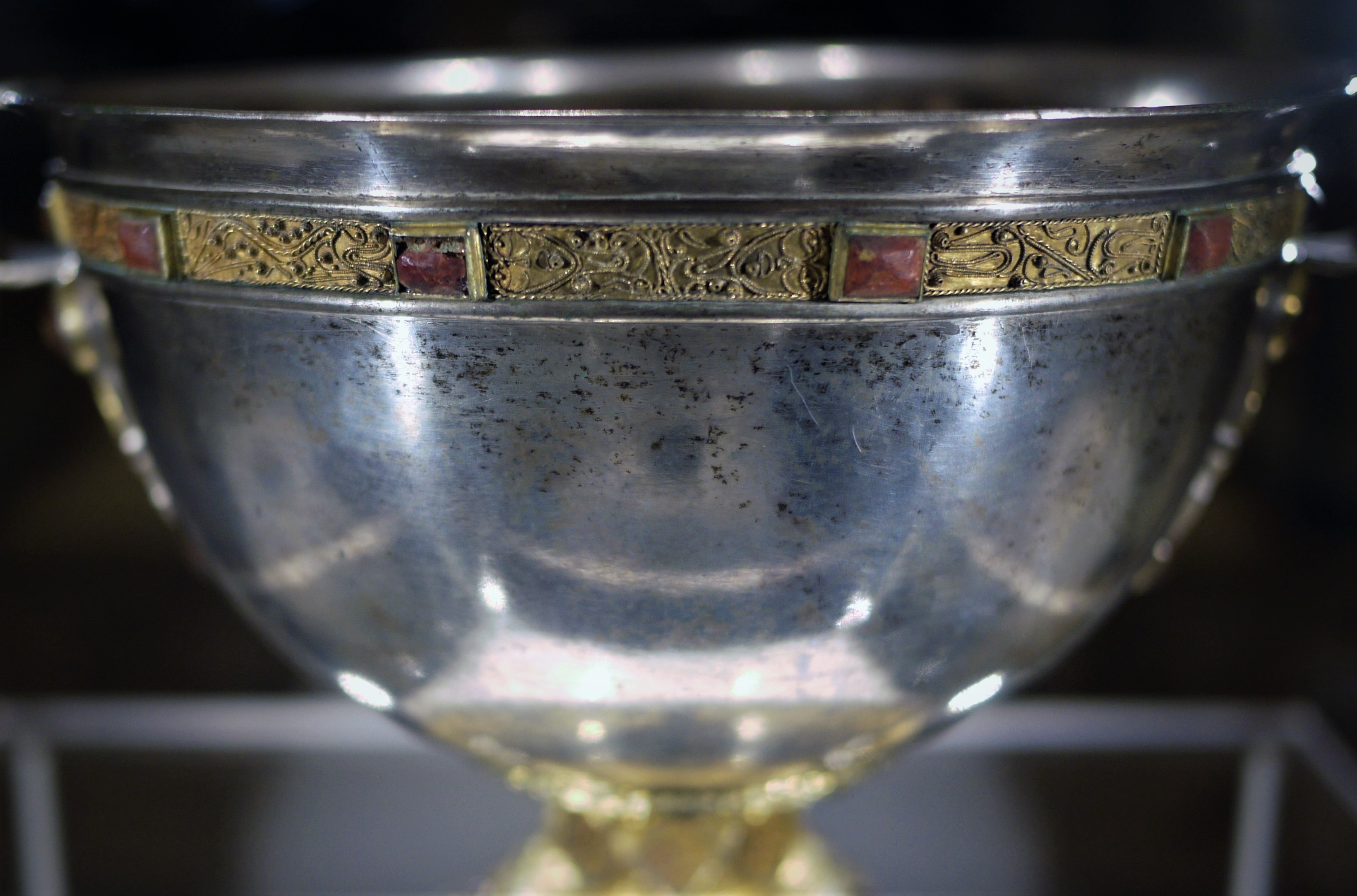 A close-up photo of the Derrynaflan Chalice, an 8th or 9th Century vessel from the Derrynaflan Hoard. It is made of silver and decorated with gold and enamel. The hoard was found in the 1980 CE near Derrynaflan in County Tipperary, Ireland. (Color and clarity digitally adjusted from original)