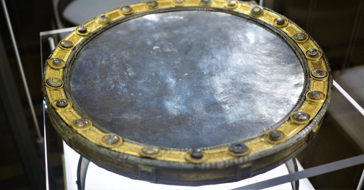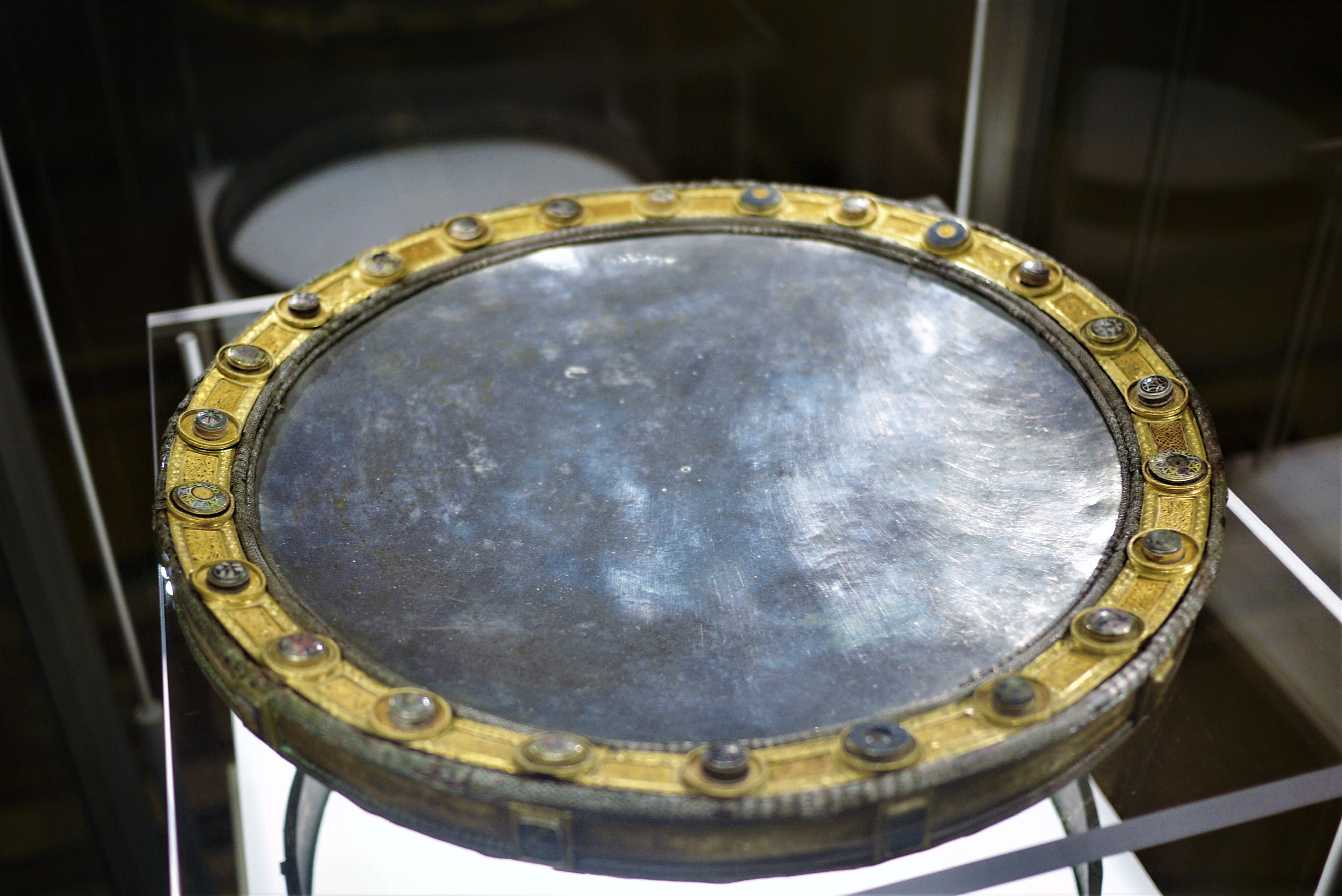 An 8th or 9th Century CE silver paten and accompanying bronze base from the Derrynaflan Hoard. It is made of silver and decorated with gold and enamel. The hoard was found in the 1980 CE near Derrynaflan in County Tipperary, Ireland. (Color and clarity digitally adjusted from original)
