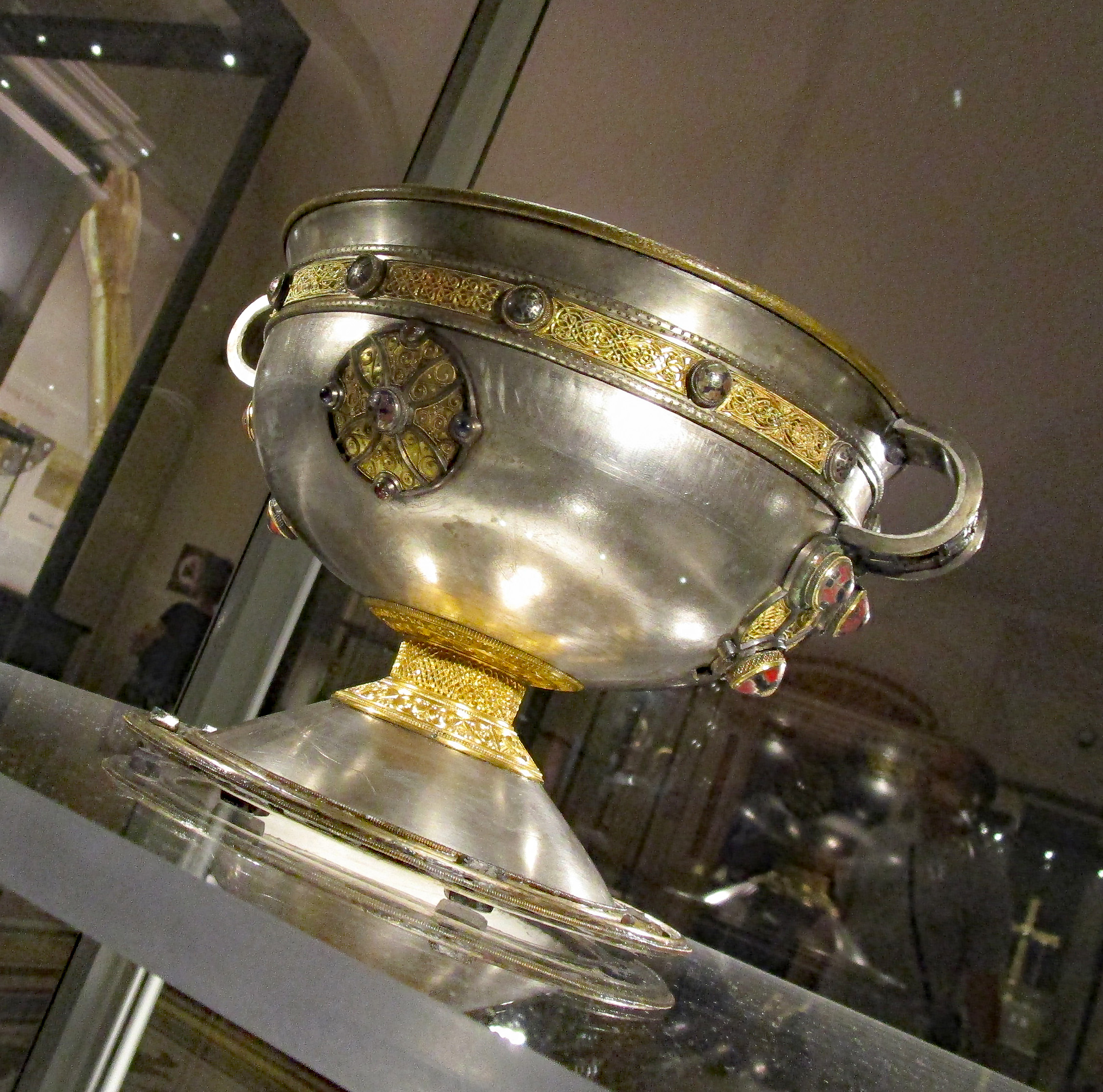 An 8th Century CE silver liturgical chalice found in near Ardagh in County Limerick, Ireland. The bowl and foot of the chalice is made of silver, and it is decorated with gold, amber, glass and enamel. Part of the Ardagh Hoard. Image republished with permission from photographer Ken Quail.