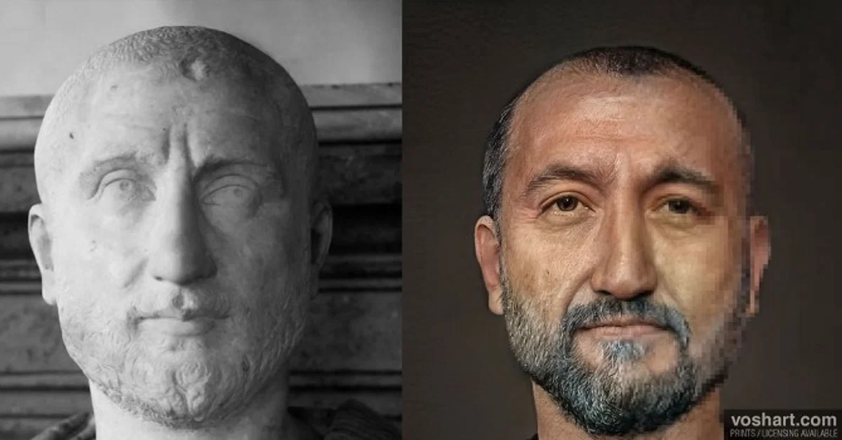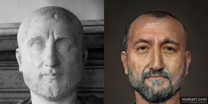 A photorealistic representation of what the Roman emperor Gordian II (r. 238 CE) may have looked like. Based on contemporary and near contemporary descriptions, as well as archaeological evidence. Pictured alongside the reconstruction is a bust of Gordian II from the Capitoline Museum. Made using Photoshop and Artbreeder, a neural net tool.