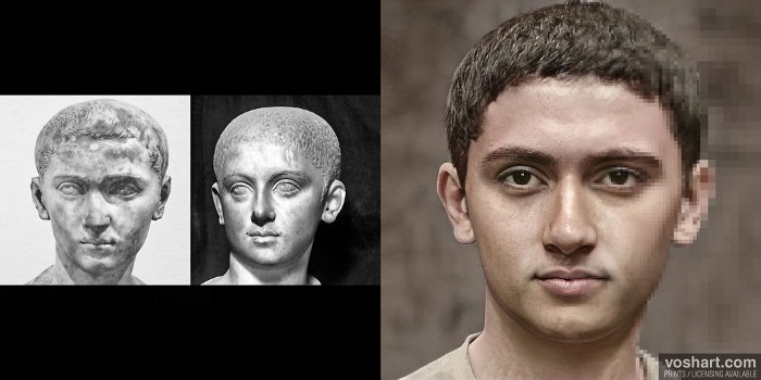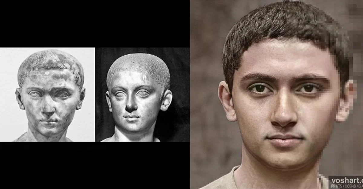 A photorealistic representation of what the Roman emperor Philip II (r. 247-249 CE) may have looked like. The young emperor was elevated to co-emperor by his father in 247 CE at the age of 10. Based on contemporary and near contemporary descriptions, as well as archaeological evidence. Pictured alongside the reconstruction are the bust of Philip II from the National Archaeological Museum of Venice (left) and the Capitoline Museum (right). Made using Photoshop and Artbreeder, a neural net tool.