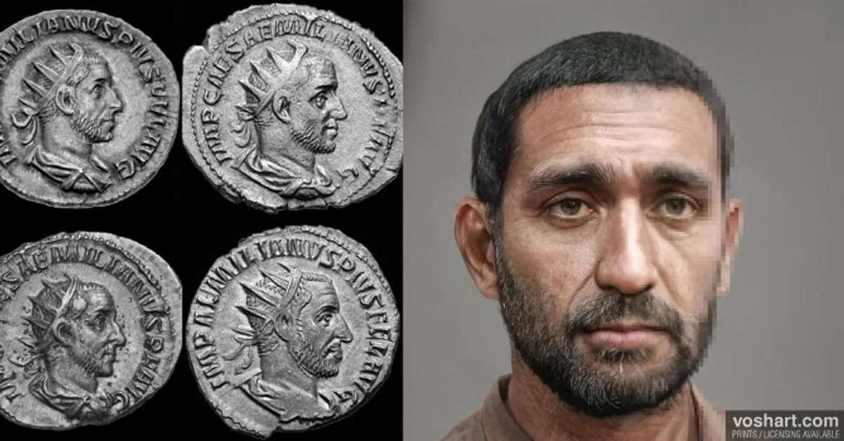 A photorealistic representation of what the Roman emperor Aemilian (r. 253 CE) may have looked like. Based on contemporary and near contemporary descriptions, as well as archaeological evidence. Pictured alongside the reconstruction are the four coin portraits used as references. Made using Photoshop and Artbreeder, a neural net tool.