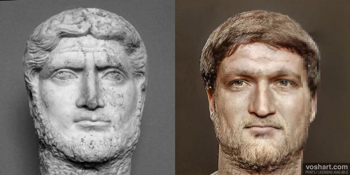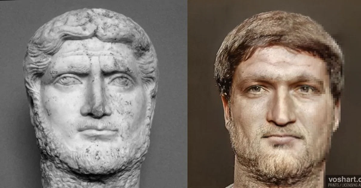 A photorealistic representation of what the Roman emperor Gallienus (r. 253-268 CE) may have looked like. Based on contemporary and near contemporary descriptions, as well as archaeological evidence. Pictured alongside the reconstruction is a bust of Gallienus from the Ny Carlsberg Glyptotek. Made using Photoshop and Artbreeder, a neural net tool.