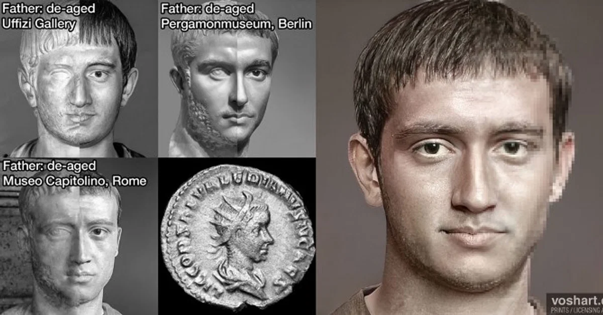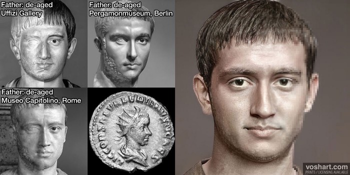 A photorealistic representation of what the Roman emperor Saloninus (r. 258-260 CE) may have looked like. Based on contemporary and near contemporary descriptions, as well as de-aged portraits of his father, Gallienus (r. 253-268 CE) Pictured alongside the reconstruction is a coin portrait of Saloninus as well as three de-aged portraits of Gallienus. Made using Photoshop and Artbreeder, a neural net tool.