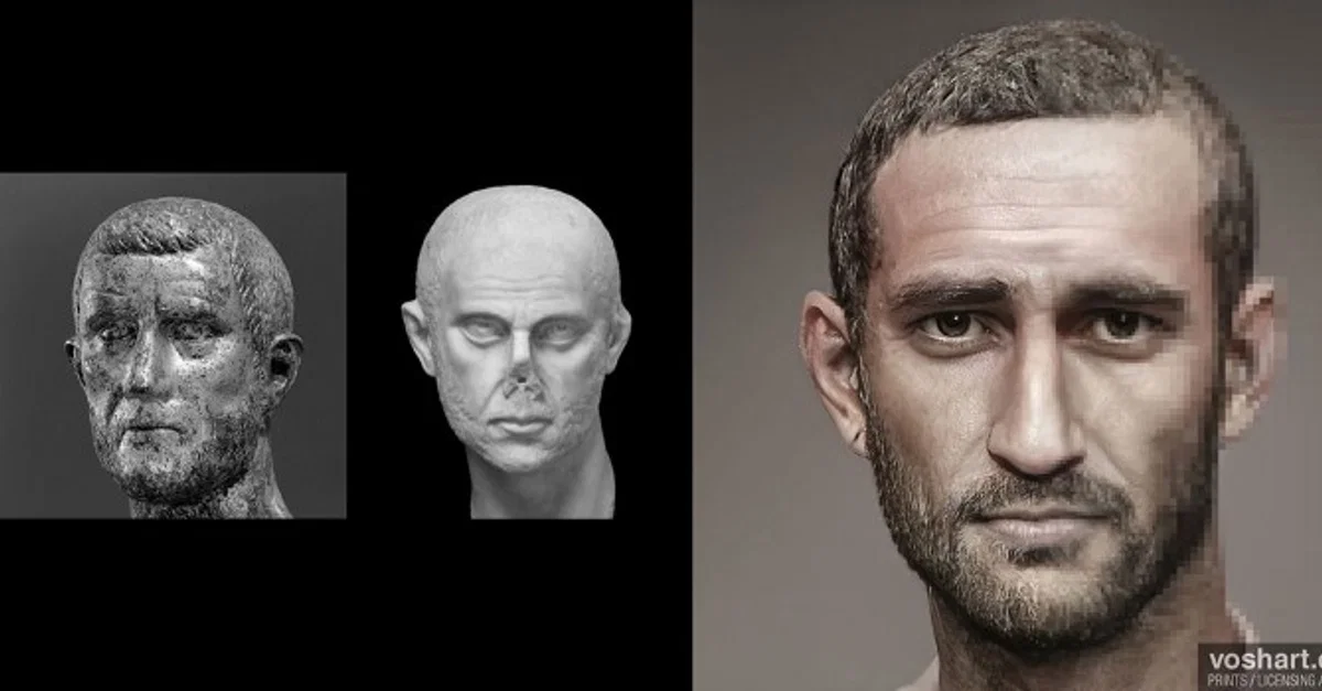 A photorealistic representation of what the Roman emperor Aurelian (r. 270-275 CE) may have looked like. Based on contemporary and near contemporary descriptions, as well as archaeological evidence. Pictured alongside the reconstruction are two probable busts of Aurelian. Made using Photoshop and Artbreeder, a neural net tool.