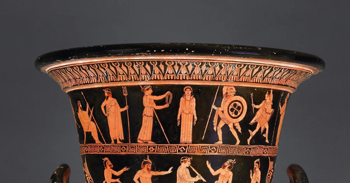 Red-figure calyx-krater (mixing jar), c. 460-450 BCE, painted in Attica, Greece, and found in Altamura, Italy, attributed to The Niobid Painter. The Pandora Vase is named after the top frieze of side A, which shows the creation of Pandora, the first woman according to ancient Greek mythology. Pandora was made by Hephaestus to carry out Zeus’ will by bringing misery to men with her pithos jar containing pains and trials. Nevertheless, the gifts she received from all the gods - hence her name pan (= all) plus dora (= gifts) – prepared her for a different purpose. Pandora received stunning, irresistible beauty from Aphrodite and a bold and cunning spirit from Hermes. These gifts suggest that the main reason for Pandora’s creation was to put men into torment with the fire of love, a fire fiercer and hotter than the one Prometheus had stolen from the gods for humanity. Her birth, therefore, is primarily associated with the introduction of pleasure and delight, both in love affair and in its outcome, namely family and children, to human life. This reading of the story underlines the artist’s plan for the decoration of this vase. All four friezes painted on this vase reflect how heaven and earth plunge into joy and celebration on Pandora’s deliverance to the world. The top frieze of side A illustrates the instance when the gods have given their gifts but for Athena, who brings forward the last wreath to adorn Pandora. She stands still like a marble statue in the middle, while Poseidon, Zeus, and Iris on the right and Hera on the far left are looking on. Below, a group of young men dressed as satyrs dances to the music of a flute-player. More dancing takes place on the back of the vase, where a second flute player is surrounded by six dancing women. (The British Museum, registration number 1856,1213.1)