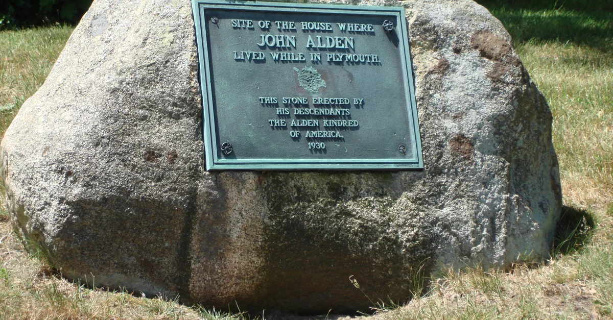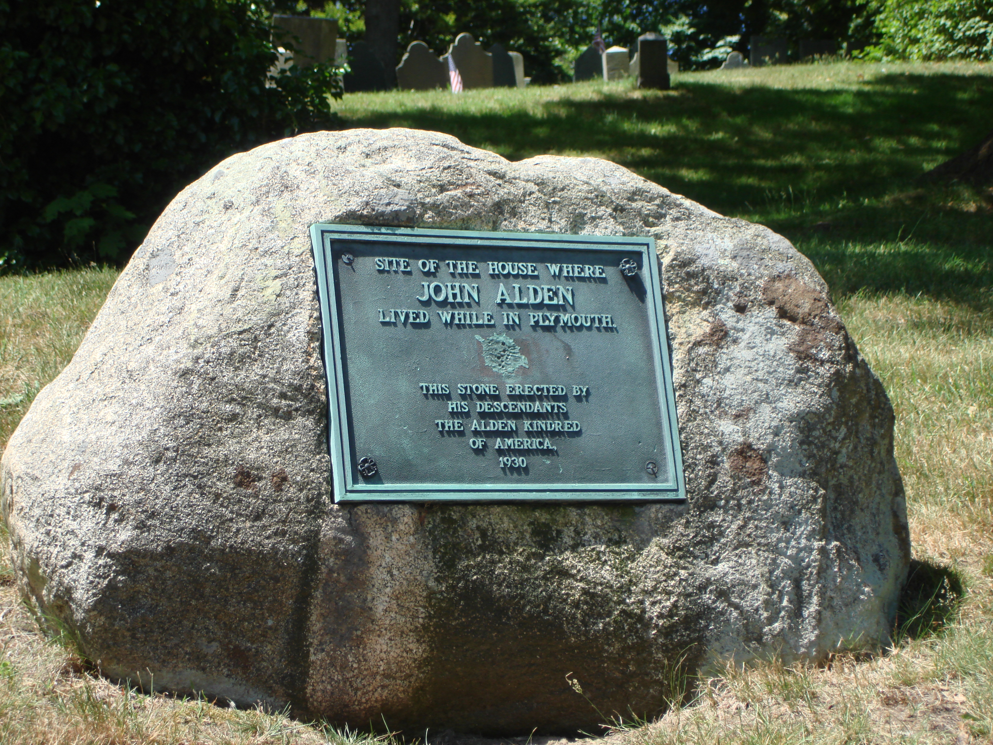 John Alden memorial stone, Plymouth, MA. John Alden (l. c. 1598-1687 CE) was a member of the crew of the Mayflower, one of the more prominent members of the Plymouth Colony, who also participated in the founding of the nearby settlement of Duxbury, Massachusetts.