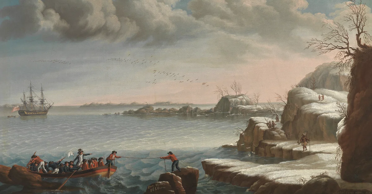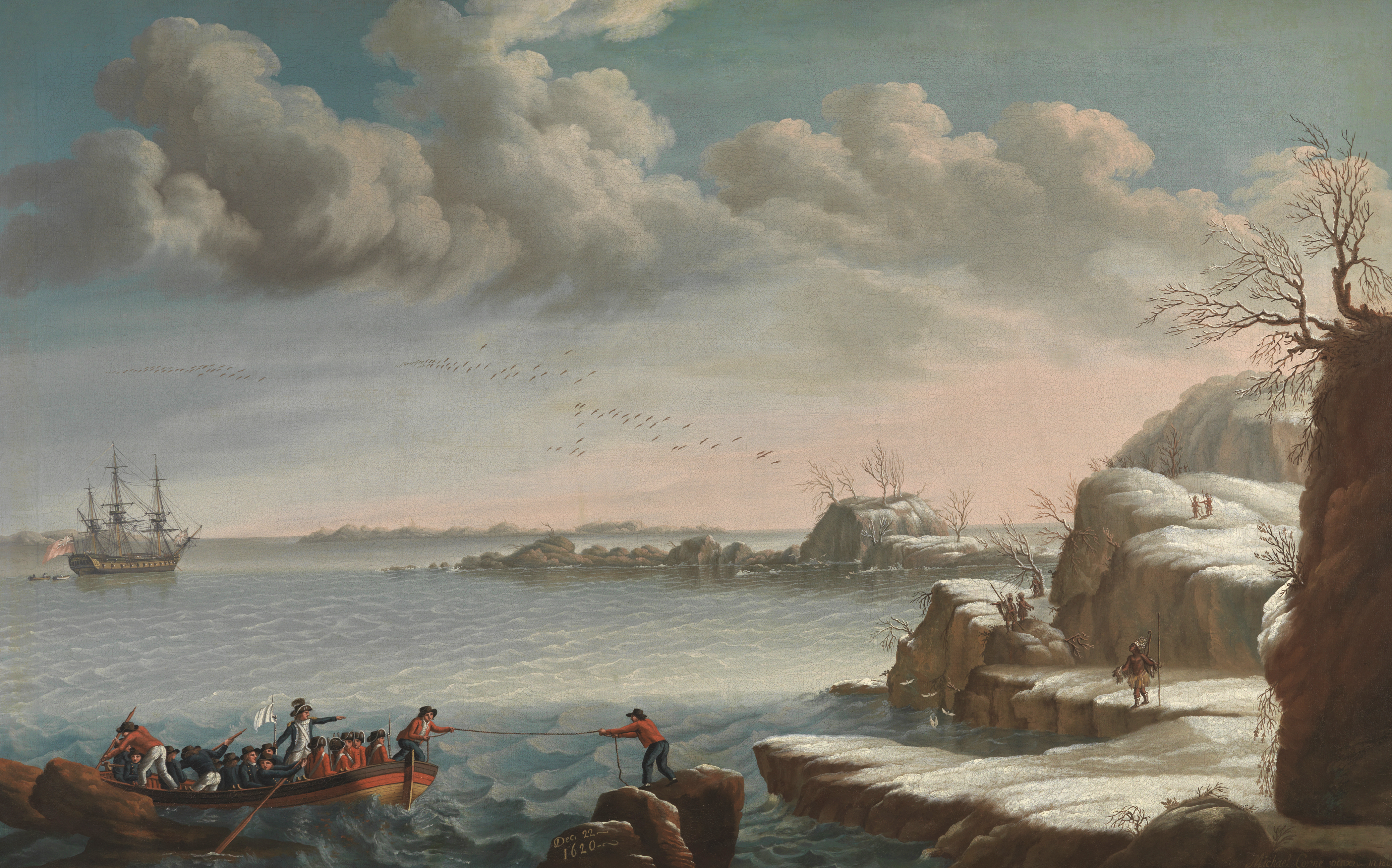 "Landing of the Pilgrims" (c. 1803 CE) is a painting by Michele Felice Cornè (1752–1845 CE). It depicts the Pilgrims who travelled to Plymouth Rock aboard the Mayflower in 1620 CE. Courtesy of the Diplomatic Reception Rooms, U.S. Department of State, Washington, D.C. As a work of the United States government depicting a painting in the public domain, this image has no known copyright restrictions.