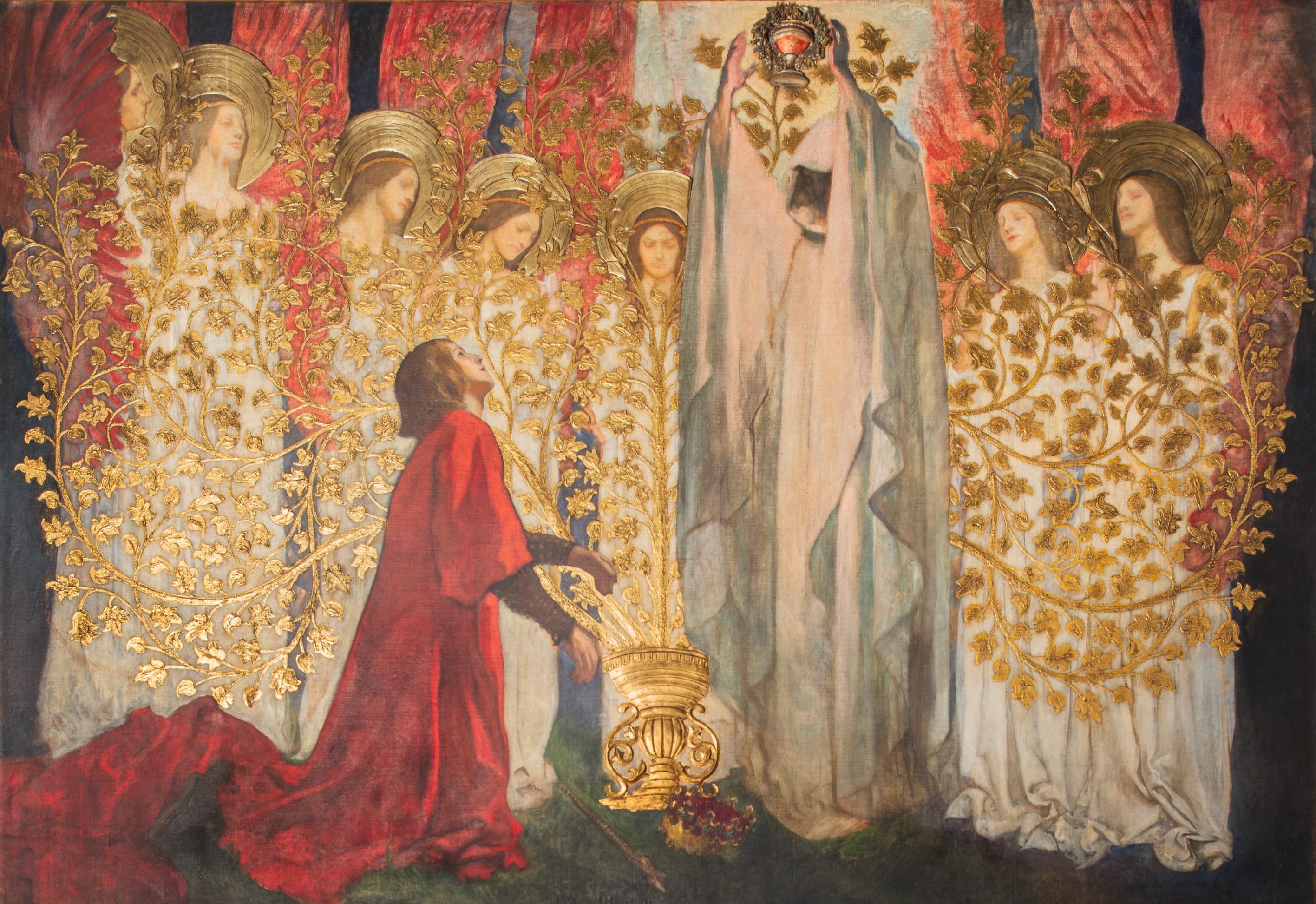 "The golden tree" was painted c. 1893-1902 CE. The painting depicts the legendary Sir Galahad receiving the Holy Grail and ascending to heaven with it after building a golden tree. It is part of the Part of the "Abbey Room Murals: The Quest and Achievement of the Holy Grail" by by Edwin Austin Abbey (1852-1911 CE).
