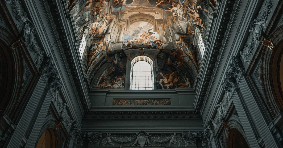 The ceiling of the Church of St. Ignatius of Loyola, Rome. It is an example of Baroque architecture, constructed between 1626 and 1650 CE. The frescoes adorning the roof depict the works of Saint Ignatius of Loyola (1491-1556 CE) and the Society of Jesus which Ignatius founded. (Courtesy of Unsplash)