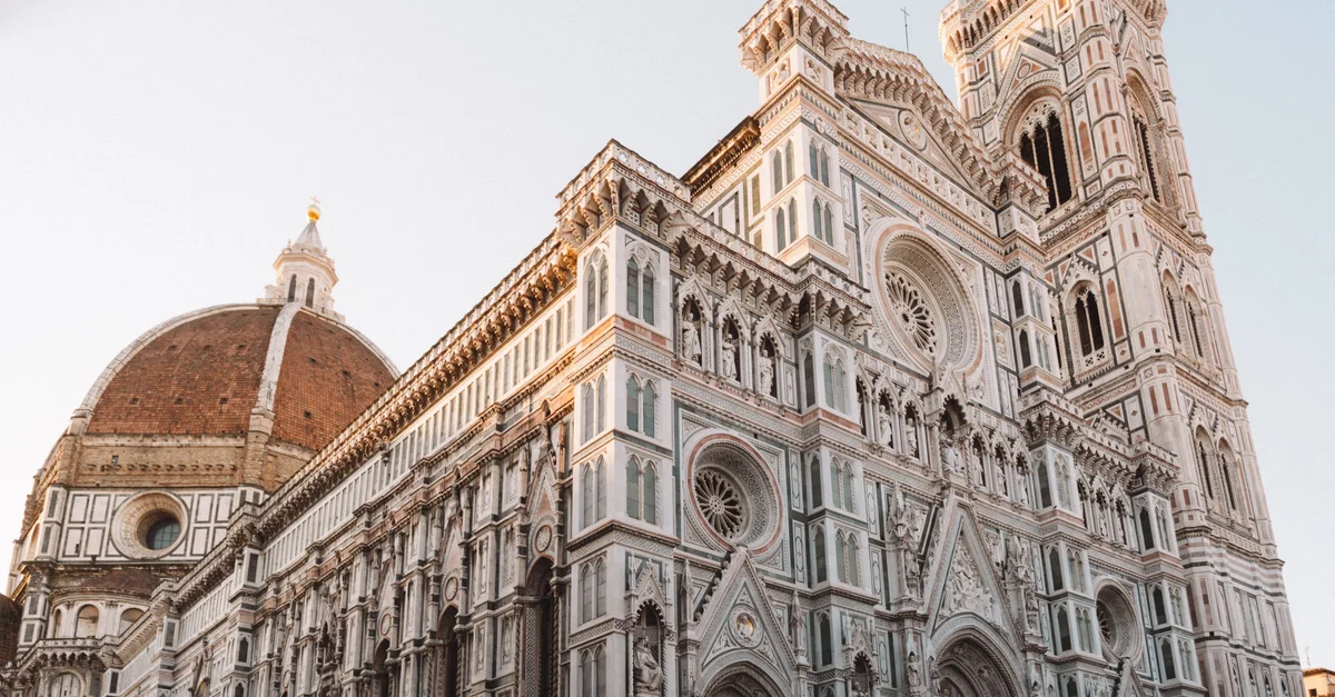 The facade of the Florence Cathedral with the dome visible. The cathedral was designed by the Italian Renaissance architect Filippo Brunelleschi (1377-1446 CE), while the facade is a modern addition.