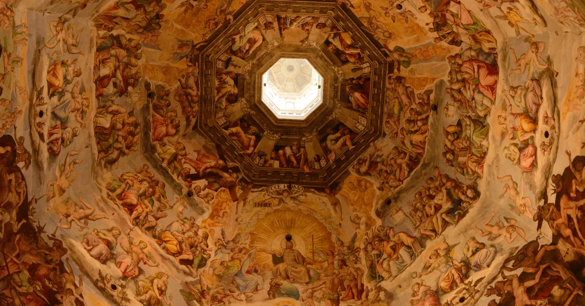 Ceiling of the Dome of the Florence Cathedral. The dome was designed by Filippo Brunelleschi (1377-1446 CE) and completed in 1436 CE. The Florence Cathedral is a classic example of Renaissance architecture.