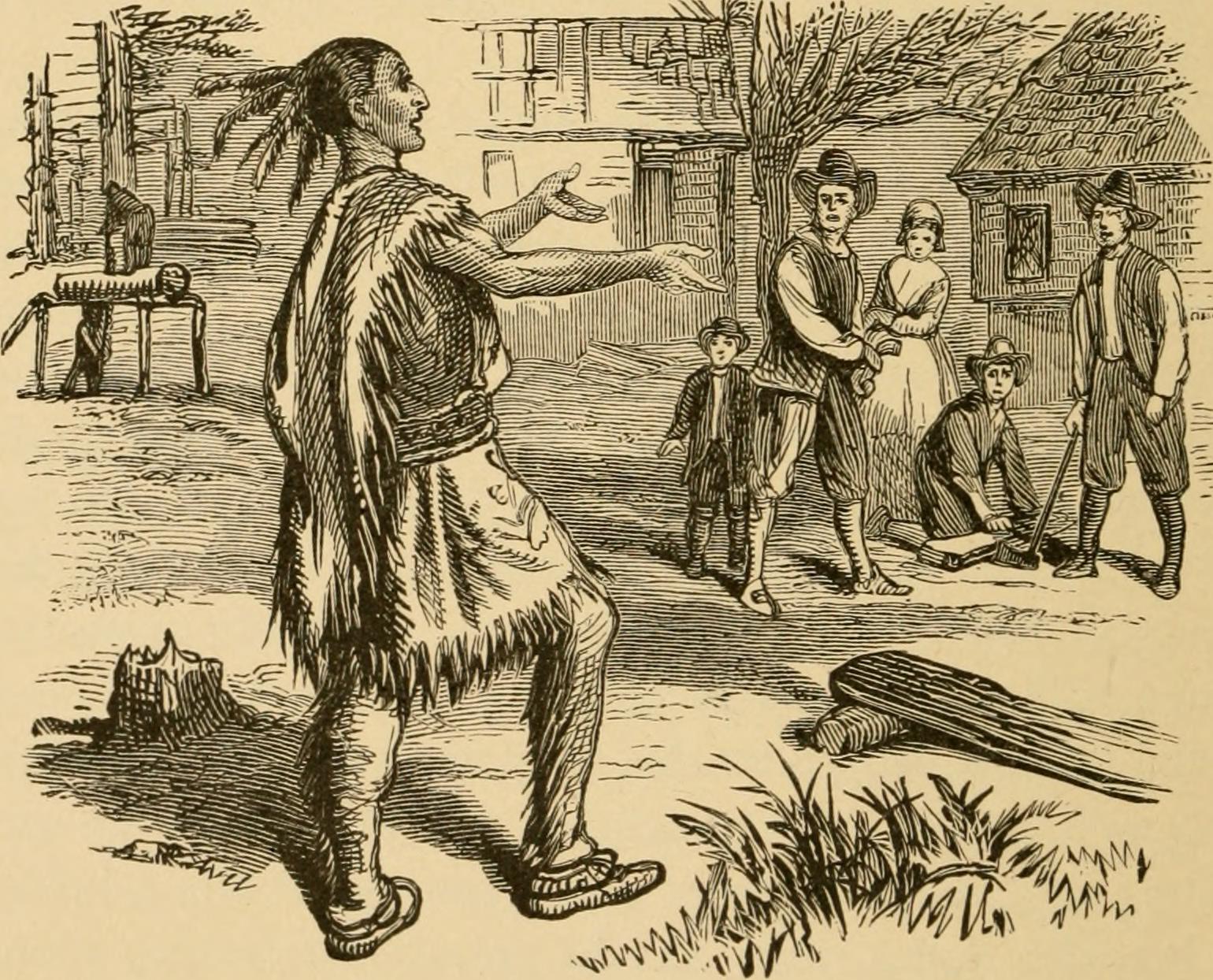 Samoset (c. 1590–1653 CE) walking into Plymouth Colony and greeting the colonists in English. Image from page 155 of "Young folks' history of the United States" (1903 CE)