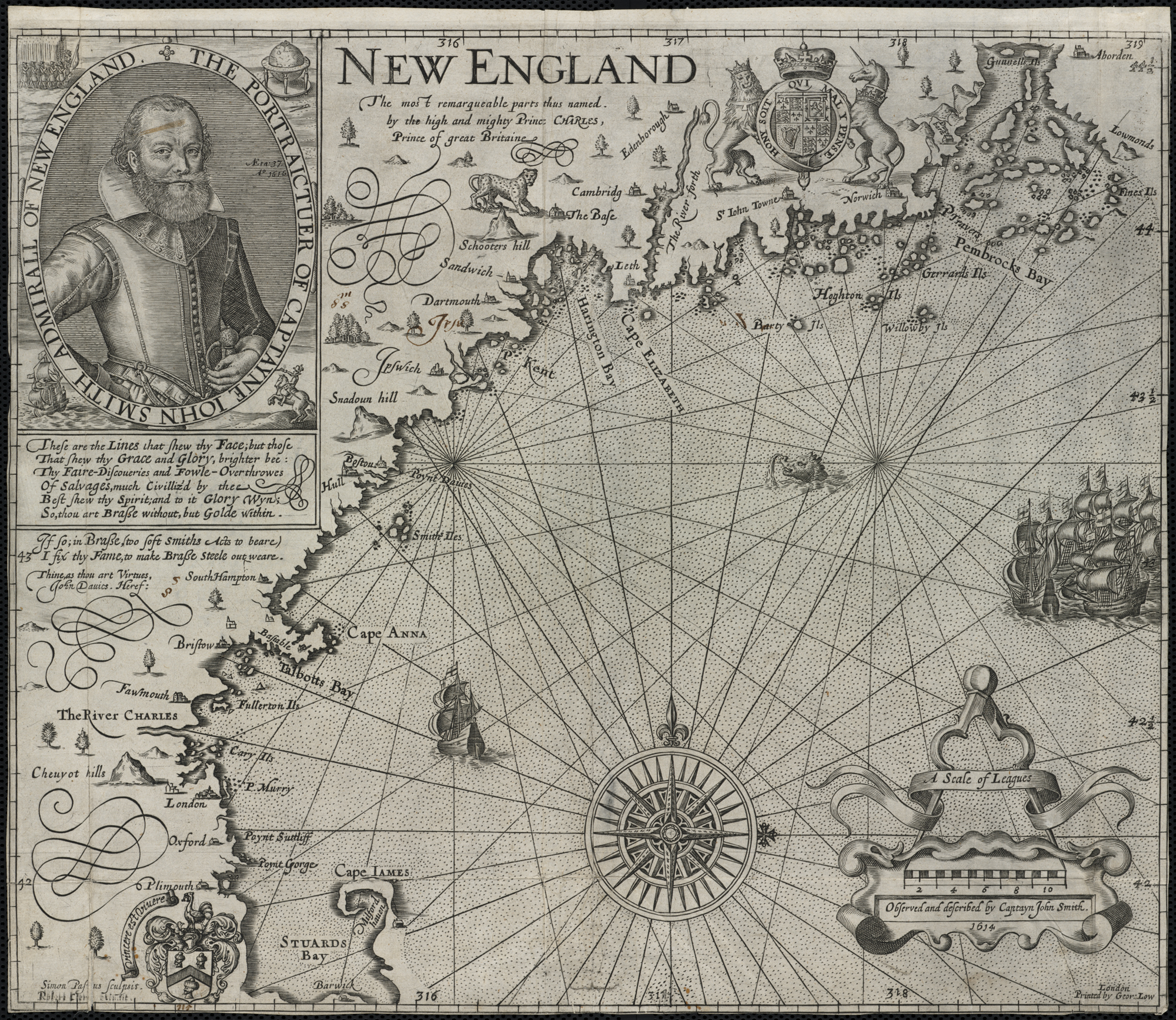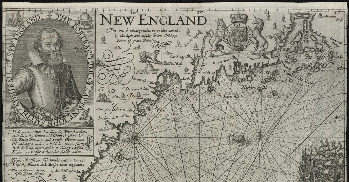 Map of New England by Captain John Smith Printed by Geor. Low, 1624 CE Based on Smith's 1614 CE voyage, this is the first printed map to use the name “New England” for the region and was used by the pilgrims who founded Plymouth Colony.