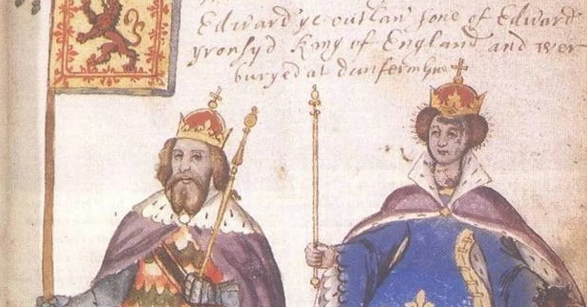 A c. 1591 CE illustration of Queen Margaret of Scotland (c. 1046-1093 CE) and her husband Malcolm III of Scotland (r. 1058-1093 CE). From the Seton Armorial.
