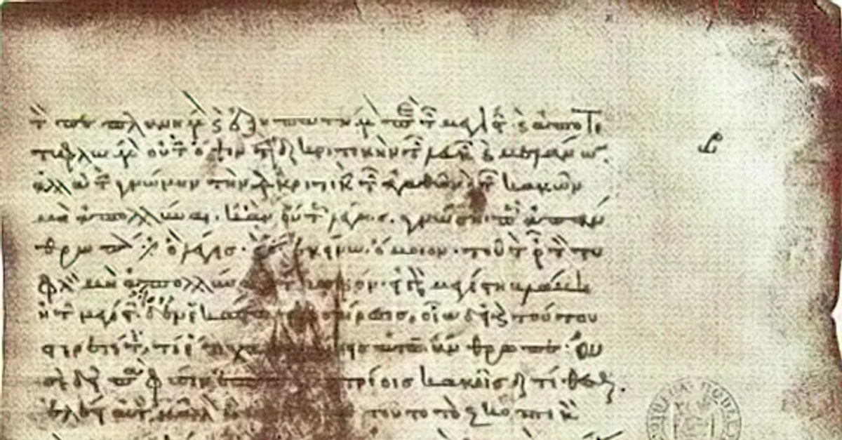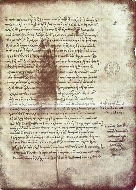 Codex Bodleianus (Cod. graec. Misc. 251, Auct. T. 4. 13), Bodleian Library, c. 11th or 12th century CE. The Discourses of Epictetus by Arrian. The large stain on the manuscript on this page (Book 1. 18. 8-11) has made this passage partially illegible. Photo is from Contributions to a Bibliography of Epictetus, by W. A. Oldfather. University of Illinois, 1927. This monochrome image has been colour-adjusted to make it appear closer in colour to the medieval manuscript.