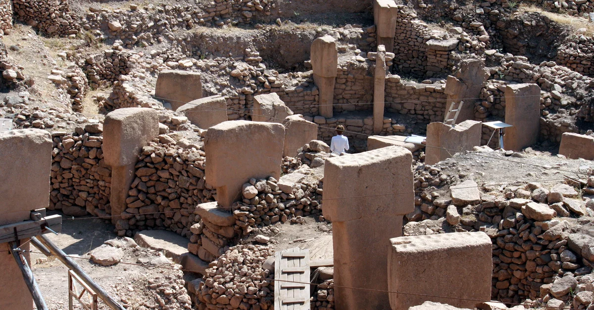 Göbekli Tepe is a c. 12,000-year-old archaeological site in Anatolia, Turkey. The monumental T-shaped pillars, often arranged in a circle, are characteristic of the site.