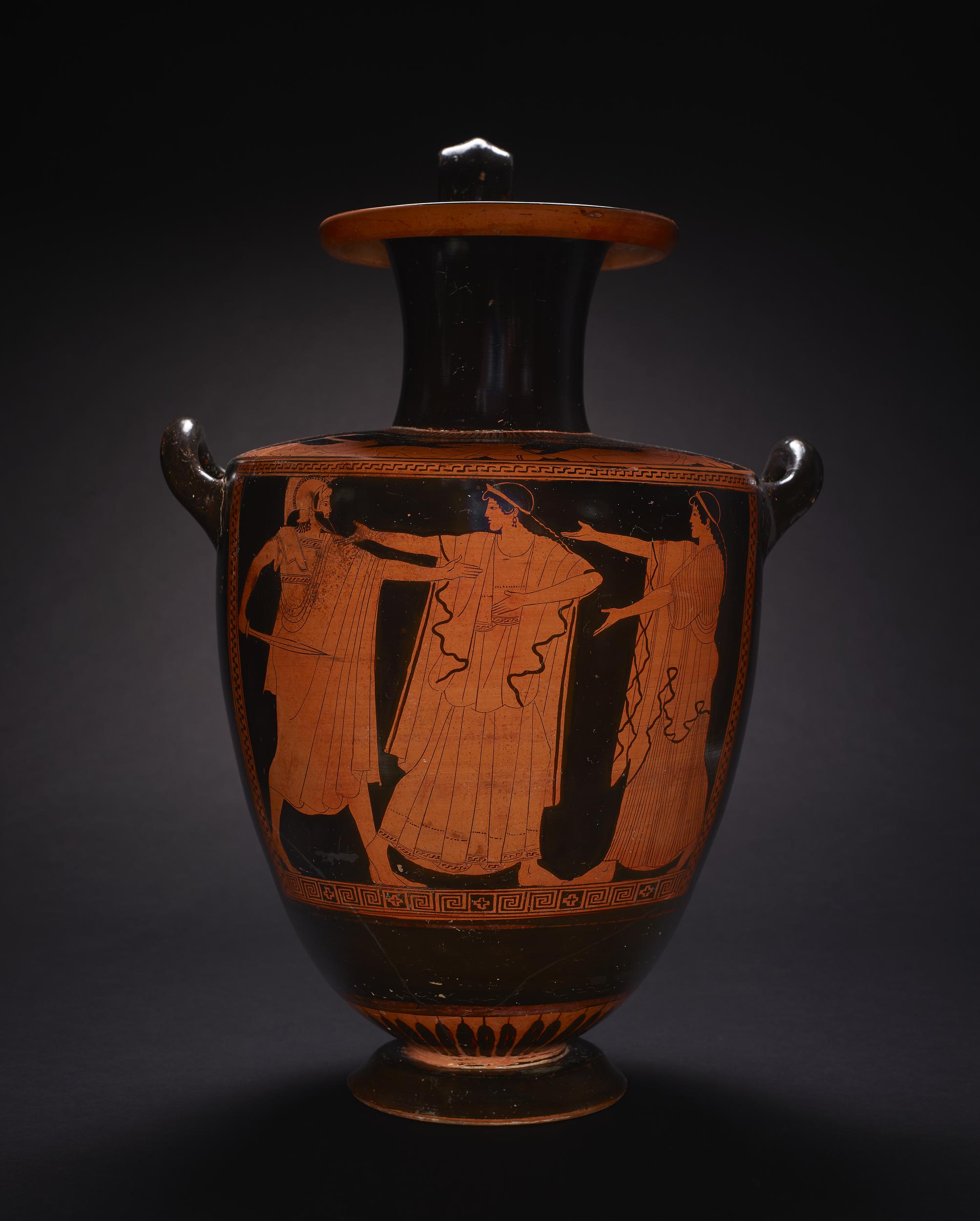 Red-figured hydria attributed to the Syriskos Painter. Made in Attica, Greece, c. 480 BCE, found in Vulci.