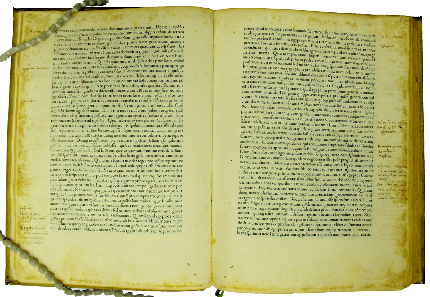 Diodorus Siculus: Bibliotheca historica (Books 1-6). Bologna: [Balthasar Azoguidus], 1472 CE. Double page opening ([6v-7r]) showing the copious marginal annotations that are found in the volume throughout; the notes are in two early humanist hands in red and black ink, often extracting keywords. Sp Coll Hunterian Bg.3.12.