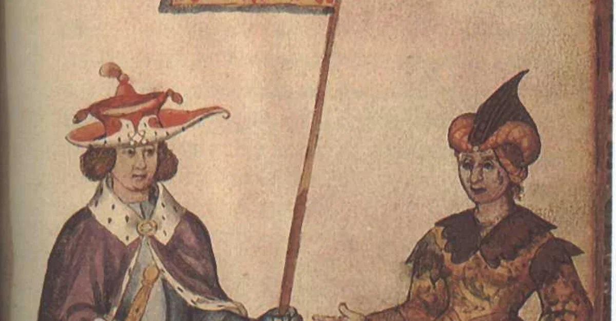 A mid-16th century CE medieval manuscript illustration showing John Balliol, king of Scotland (r. 1292-1296 CE) and his wife Isabella de Warenne (b. c. 1253 CE). (National Library of Scotland, Edinburgh)