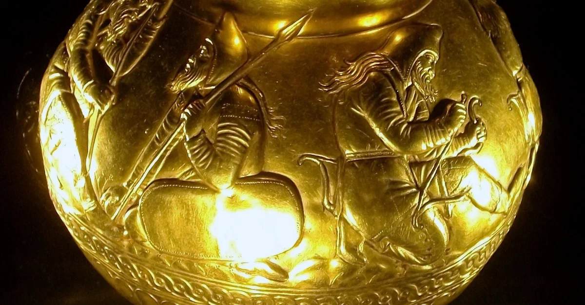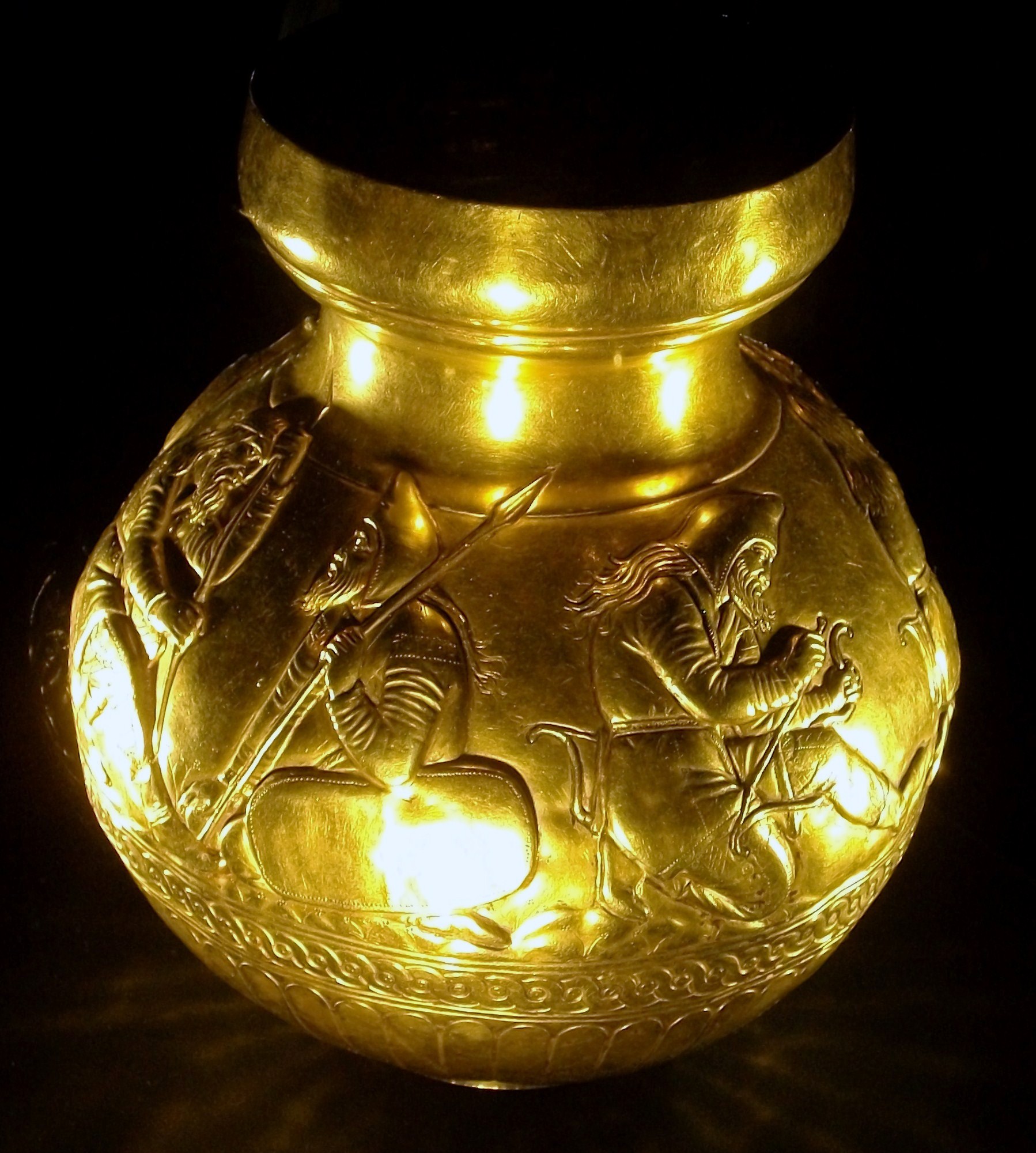 Scythian gold beaker from the Kul-Oba kurgan, Crimea. 4th century BCE. It shows bivouacked soldiers: one demonstrates how to string a bow; another removes his comrade's tooth, and another bandage a fellow's hurt leg. State Hermitage Museum, Moscow.
