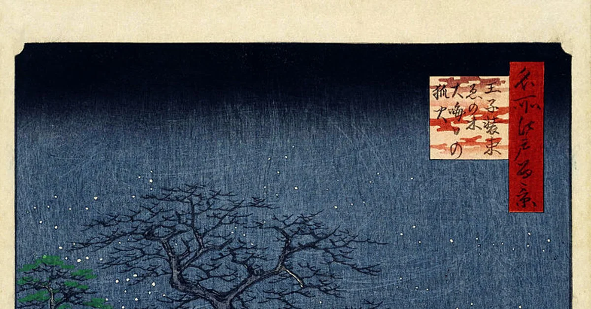 Utagawa Hiroshige: New Year's Eve Foxfires at the Changing Tree, Oji No. 118 from One Hundred Famous Views of Edo, 9th month of 1857. Woodblock print Brooklyn Museum