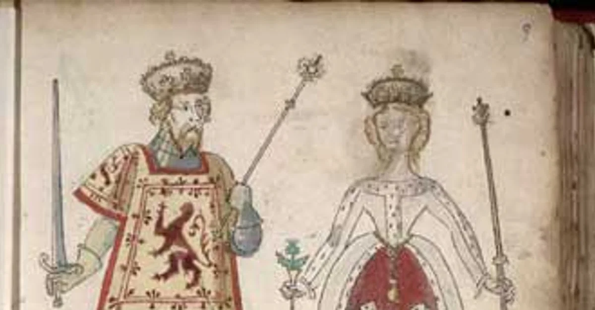 A 16th-century manuscript illustration showing Robert II of Scotland (r. 1371-1390) and his second wife Euphemia, Countess of Moray. From the Froman Armorial.