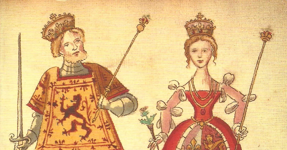 A 16th century CE manuscript illustration showing James I of Scotland (r. 1406-1437 CE) and Queen Joan Beaufort. From the Froman Armorial. (National Library of Scotland, Edinburgh).