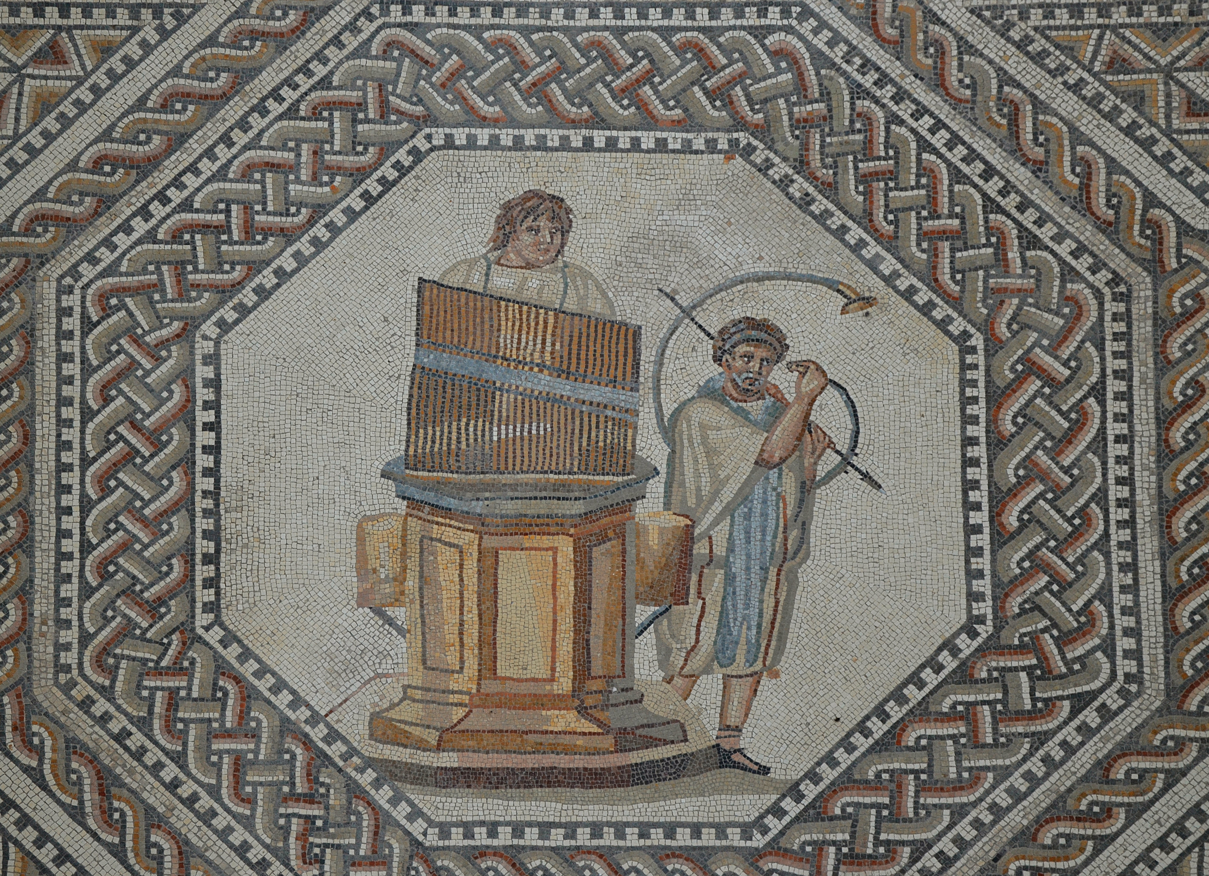 Octagon from a 3rd century CE depicting an organist and a horn player. The beginning and end of the Roman games (ludi) were often accompanied by music. The mosaicist has depicted the water organ (hydraulis), known in the ancient world since 300 BCE. The 27 organ pipes rest on a hexagonal podium which also serves to store water for the organ. The organist plays the keyboard situated behind the pipes. The other musician is playing the cornu, which is braced and supported on the shoulder of the horn player by a cross bar. From the Roman villa in Nennig, Germany.