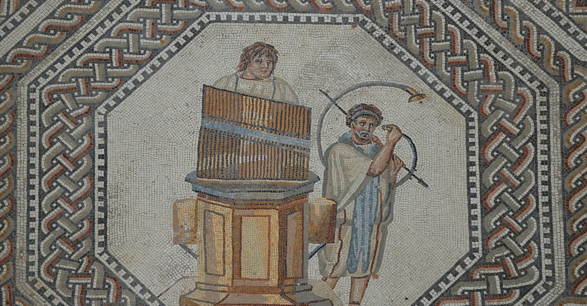 Octagon from a 3rd century CE depicting an organist and a horn player. The beginning and end of the Roman games (ludi) were often accompanied by music. The mosaicist has depicted the water organ (hydraulis), known in the ancient world since 300 BCE. The 27 organ pipes rest on a hexagonal podium which also serves to store water for the organ. The organist plays the keyboard situated behind the pipes. The other musician is playing the cornu, which is braced and supported on the shoulder of the horn player by a cross bar. From the Roman villa in Nennig, Germany.
