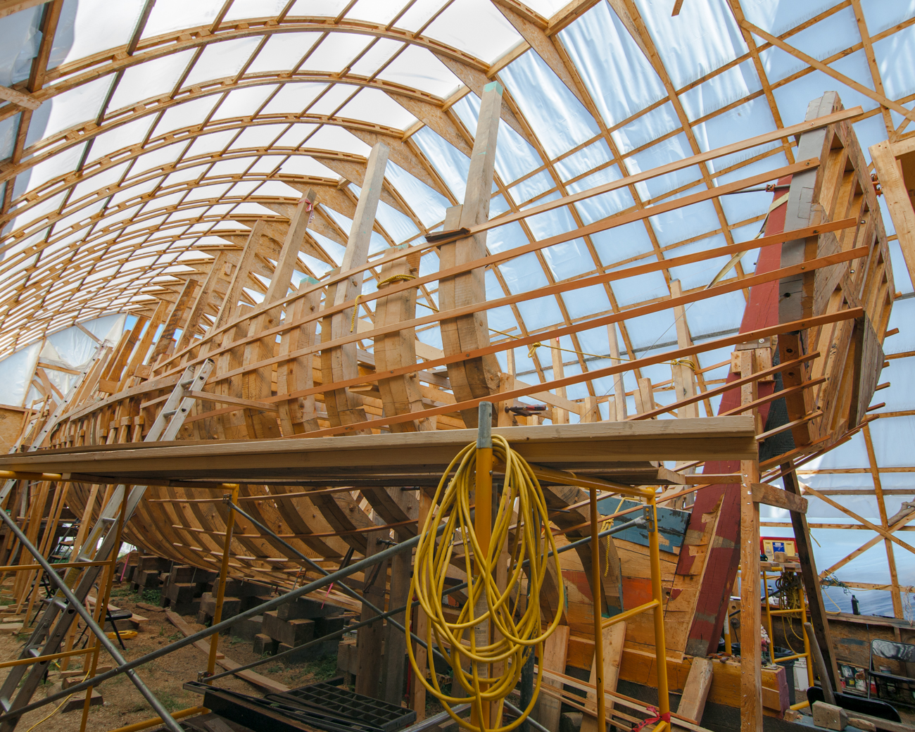 The Virginia of Sagadahoc, originally built by the colonists of the Popham Colony (1607-8 CE) being reconstructed by the Maine’s First Ship project. Photo taken in 2014 CE.
