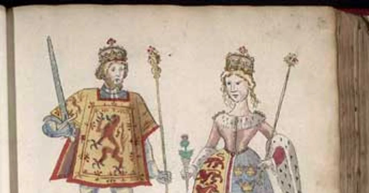 A 16th century CE manuscript illustration showing James III of Scotland (r. 1460-1488 CE) and Queen Margaret (d. 1486 CE). From the Froman Armorial. (National Library of Scotland, Edinburgh).