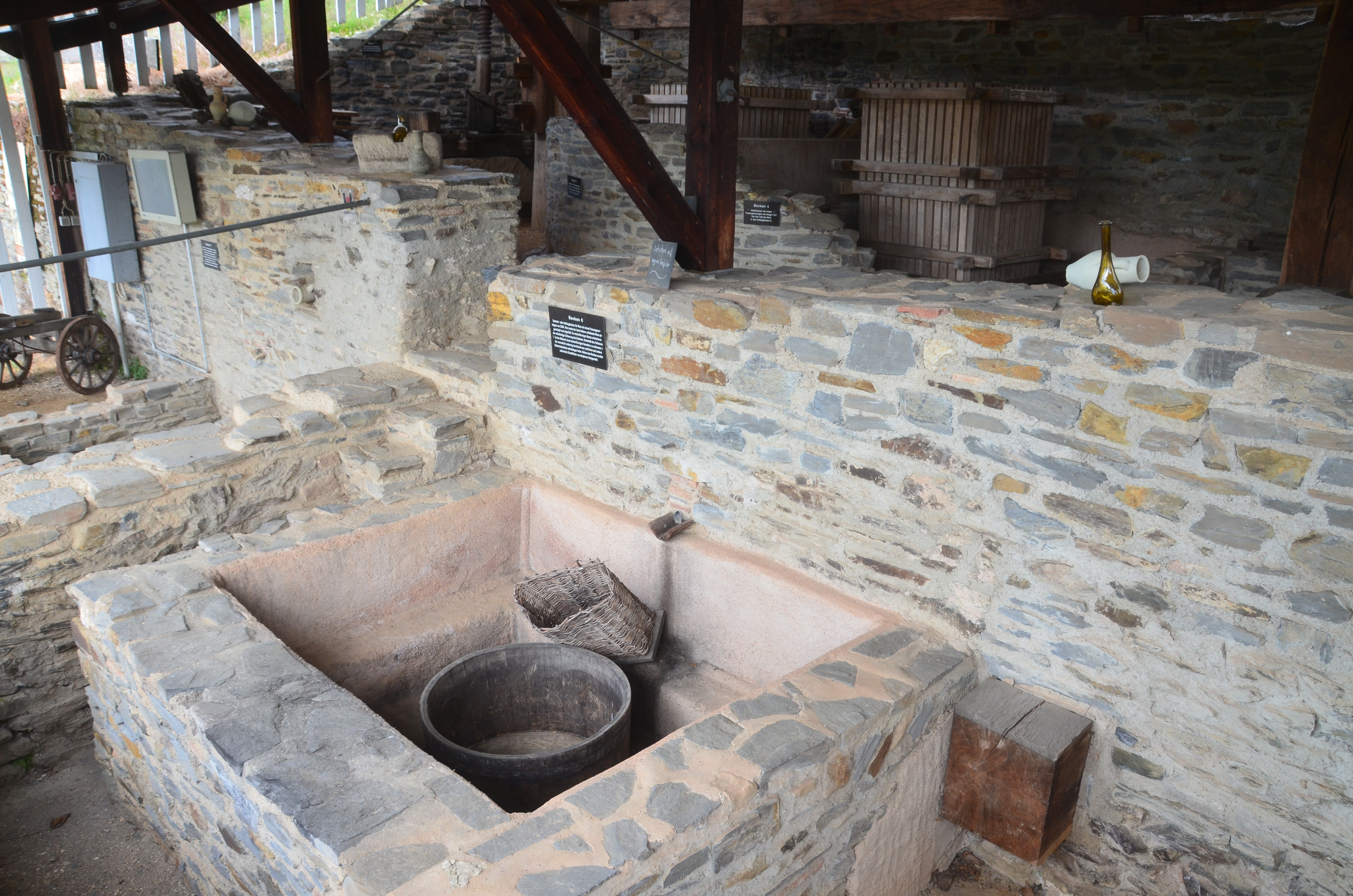 A reconstructed Roman wine press dated to the 4th century CE is located on the edge of the famous slopes of the Piesporter Goldtröpfchen vineyard in Piesport, Germany. The structure, measuring 44 metres (144 ft) in length and 20 metres (65 ft) in width, was discovered in 1985 CE and authentically reconstructed. In 1991 CE, a second wine press was found next to it, this one measuring 15 metres (49 ft) in length and five metres (16 ft) in width and containing four basins built in the 2nd century CE.