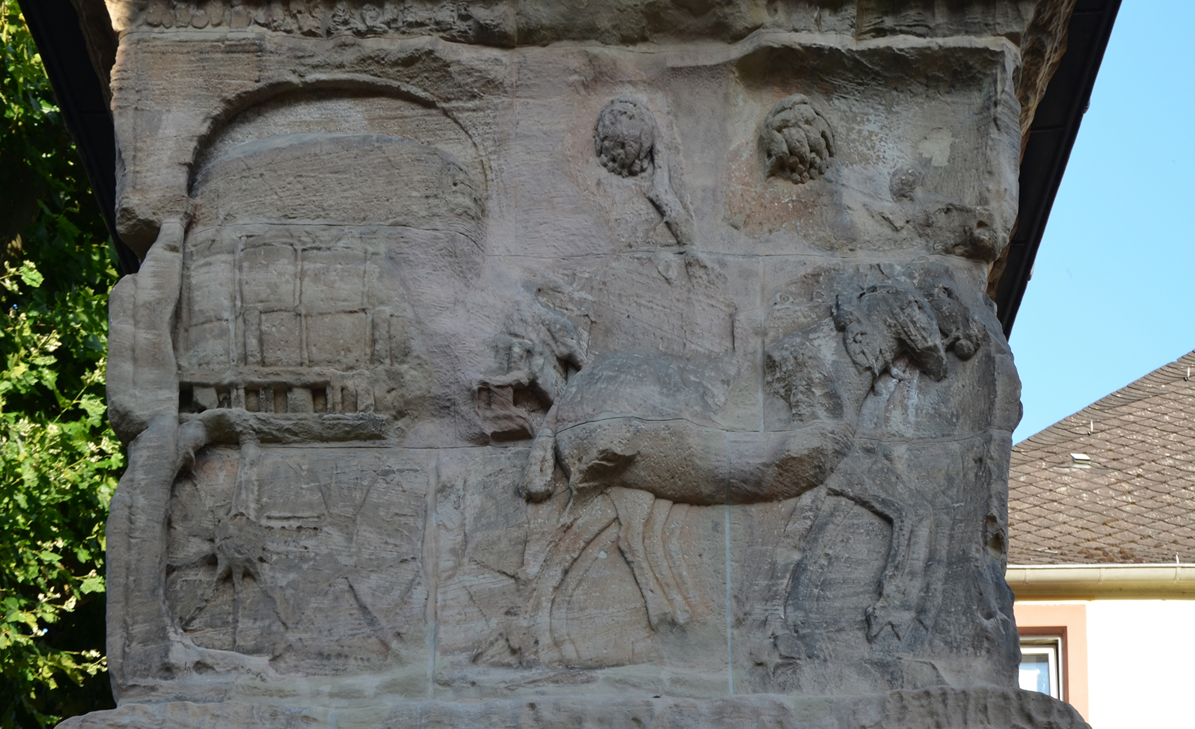 Relief from the Igel Column depicting mules pulling a four-wheeled chariot cart laden transporting bales of cloth. The Igel Column is a multi-storey Roman sandstone funerary monument located on the left bank of the Moselle some eight kilometres south of Trier. It was erected around 250 CE by two wealthy cloth merchants of Celtic origin, Secundinius Aventinus and Secundinius Securus, who were brothers.
