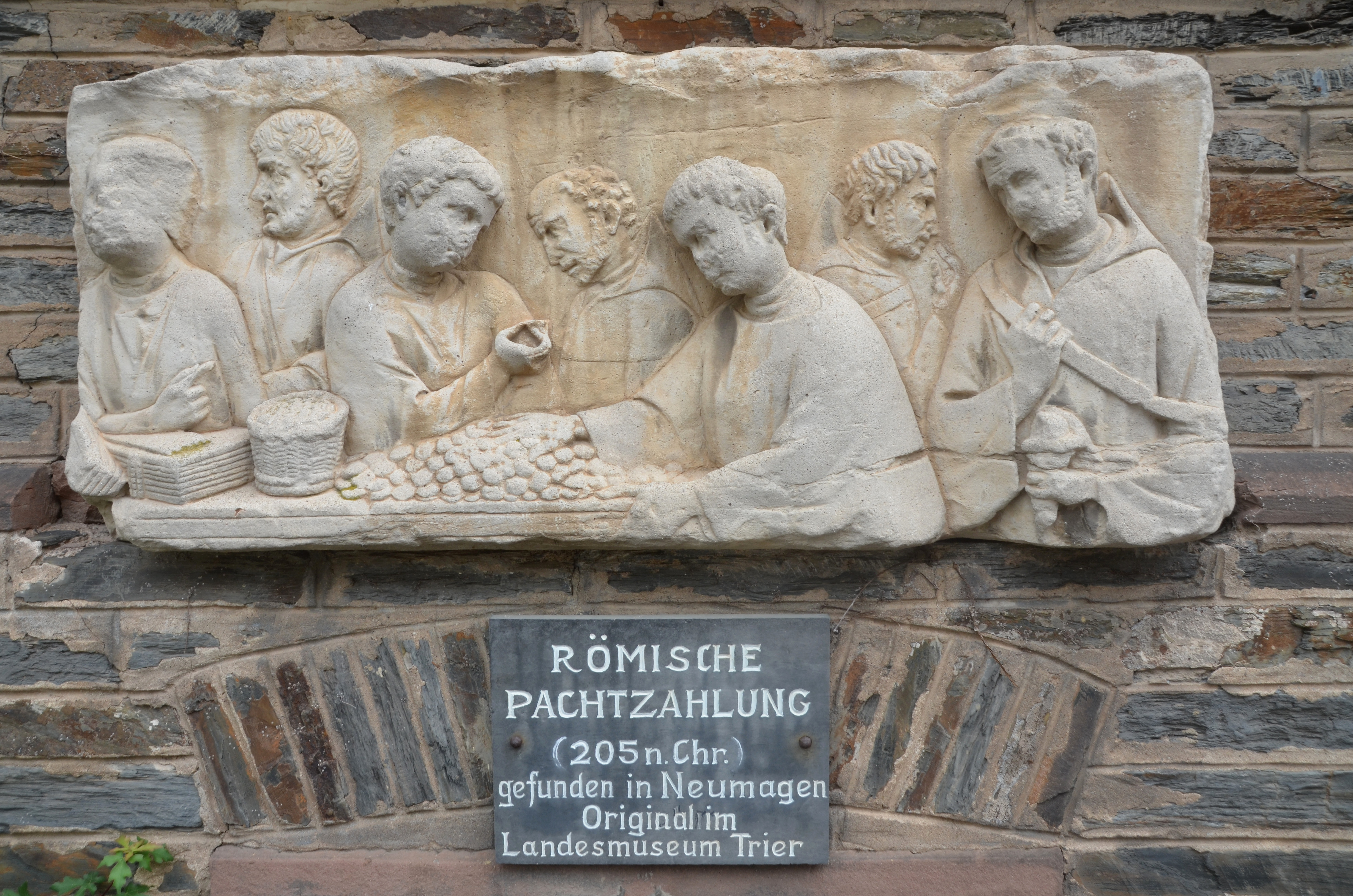 A copy of a bas-relief in Neumagen near Trier (Germany) showing taxes being collected. Depicted on the funerary relief are three Roman tax officials and four taxpayers, a basket on a table in which the tax money had to be paid and wax tablets and pens used to write notes or calculations. The original relief is kept in the Rheinisches Landesmuseum in Trier and dates to the 3rd century CE.