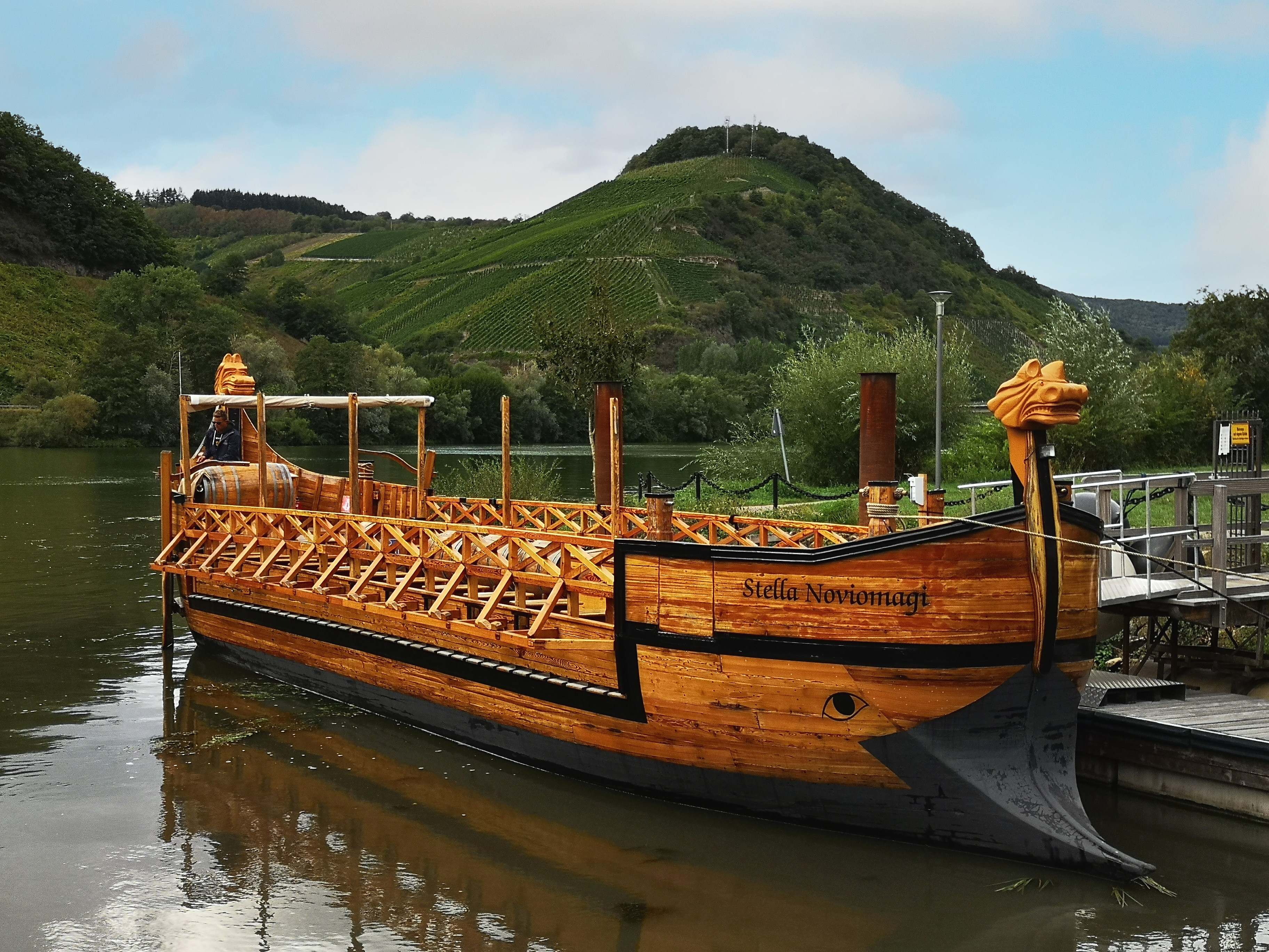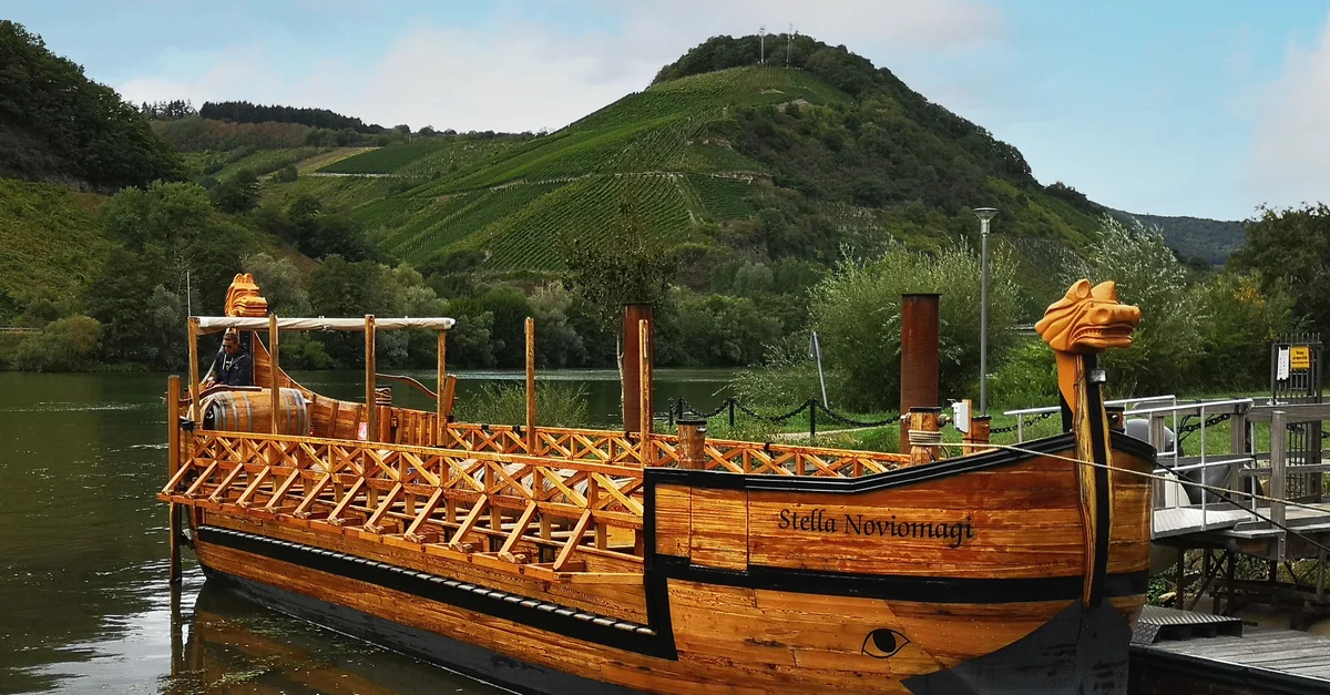 The Stella Noviomagi in Neumagen-Dhron (Germany) is a replica of a Gallo-Roman merchant ship based on a 220 CE stone funerary monument excavated from the foundations of the Roman Neumagen fort. It is a tourist attraction during the high season and make passengers marvel at the steep sloped Moselle vineyards, rising about 300 metres (984 ft) above the river.