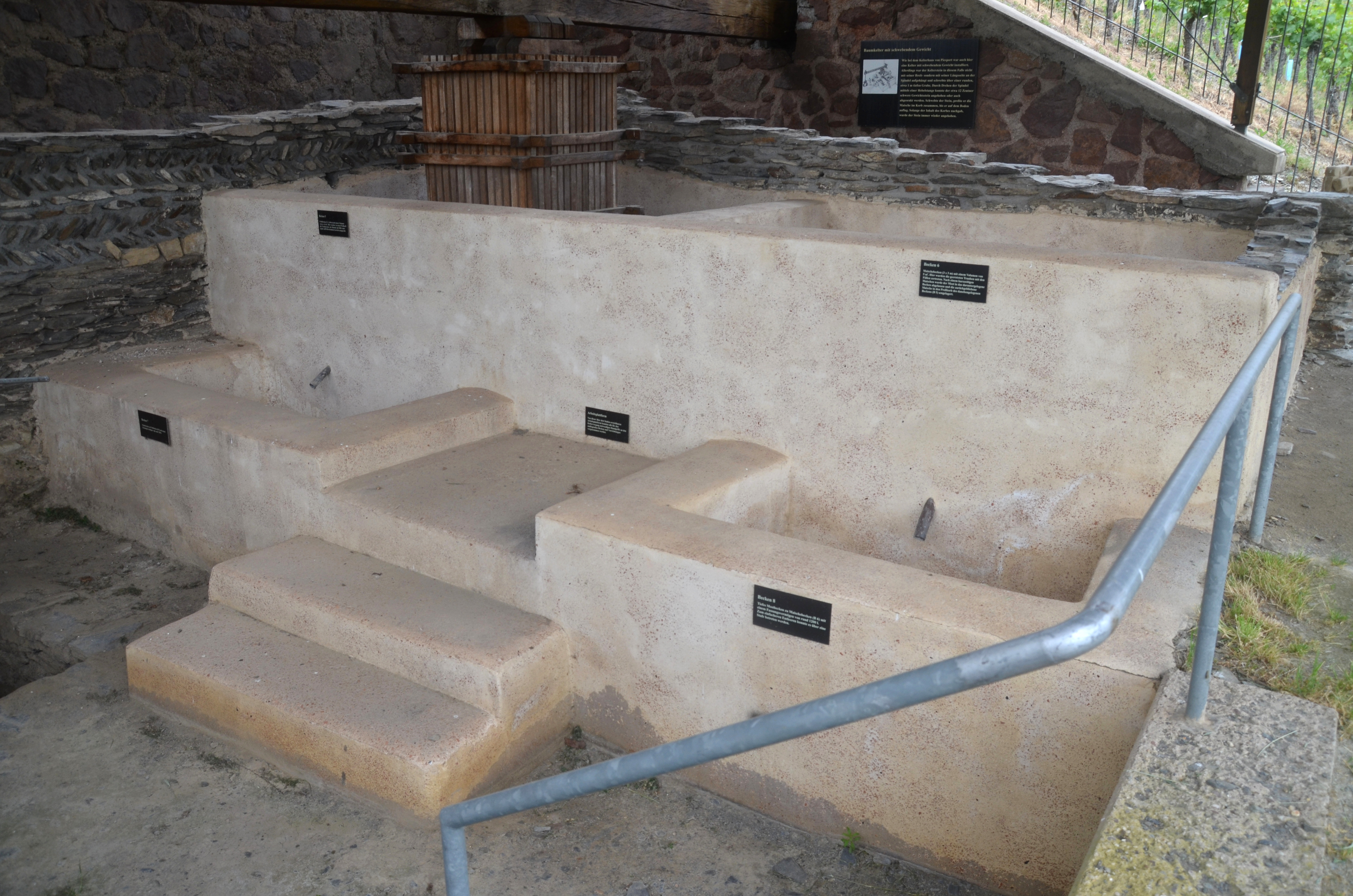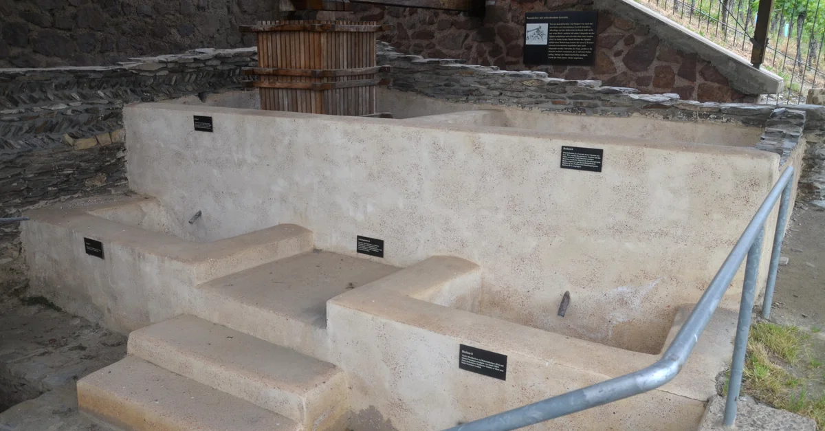 A reconstructed Roman wine press dated to the mid-3rd century CE is located on the edge of the “Brauneberger Juffer” vineyards opposite the municipality of Brauneberger, Germany. It is the best-preserved wine press found in the Moselle valley, and also the oldest restored wine press north of the Alps.