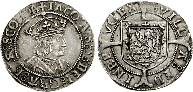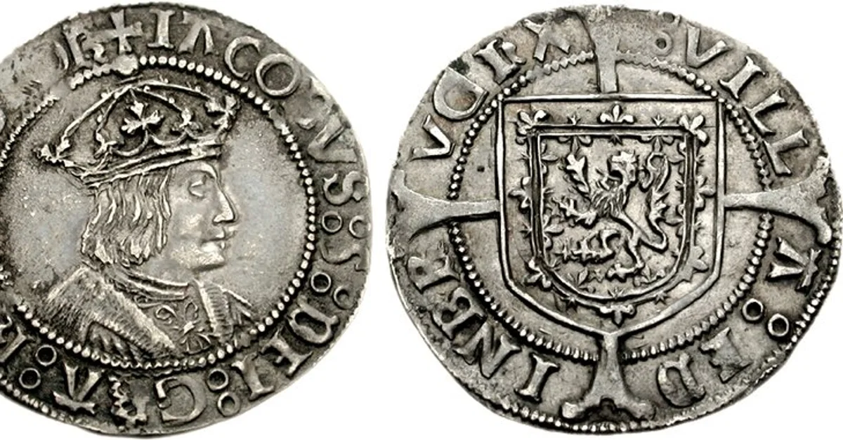 A silver groat of James V of Scotland (r. 1513-1542) showing a portrait of the king and the royal arms.