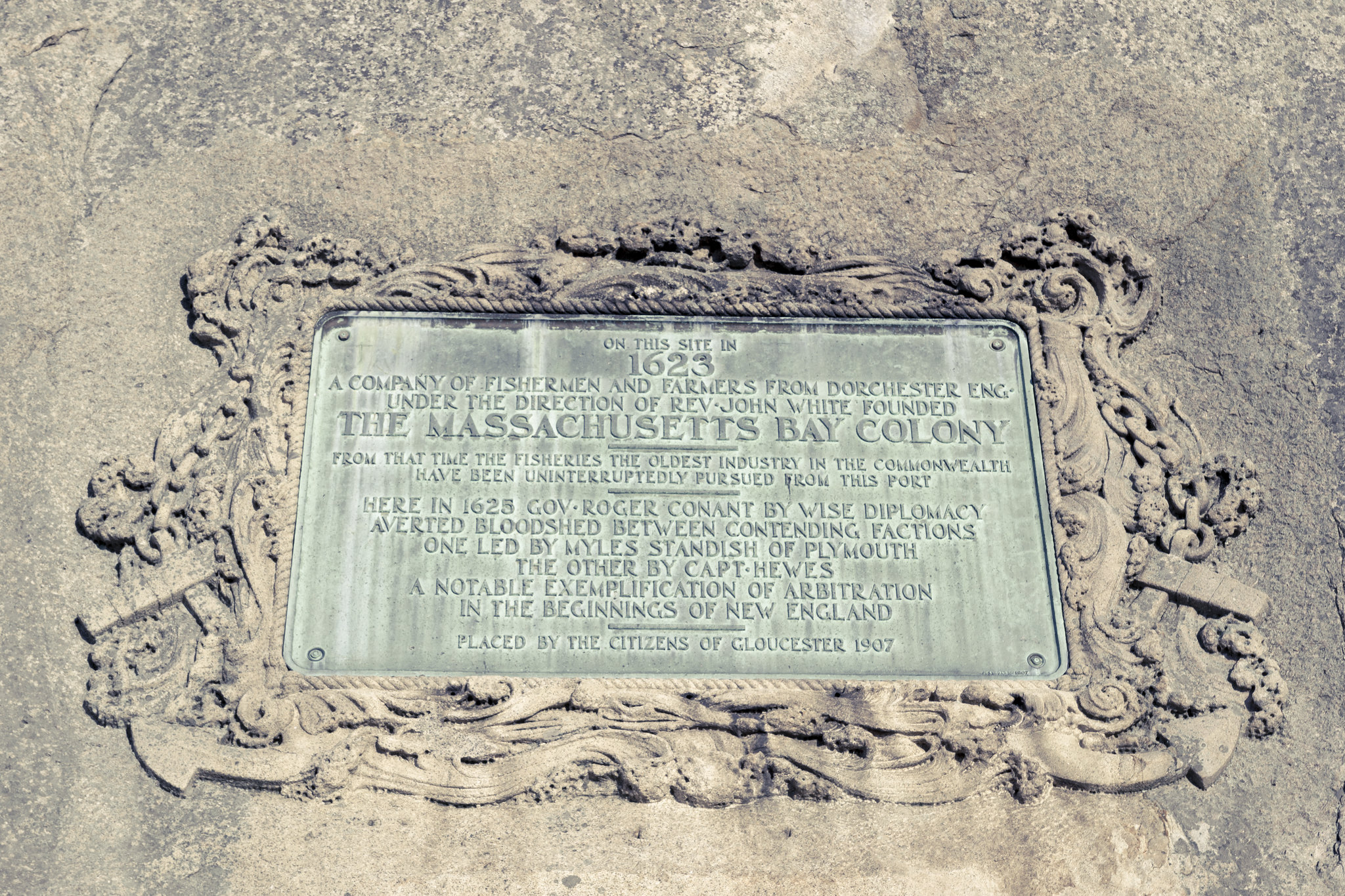 Plaque commemorating the foundation of the Massachusetts Bay Colony in 1623 CE in Gloucester, MA, placed in 1907 CE.