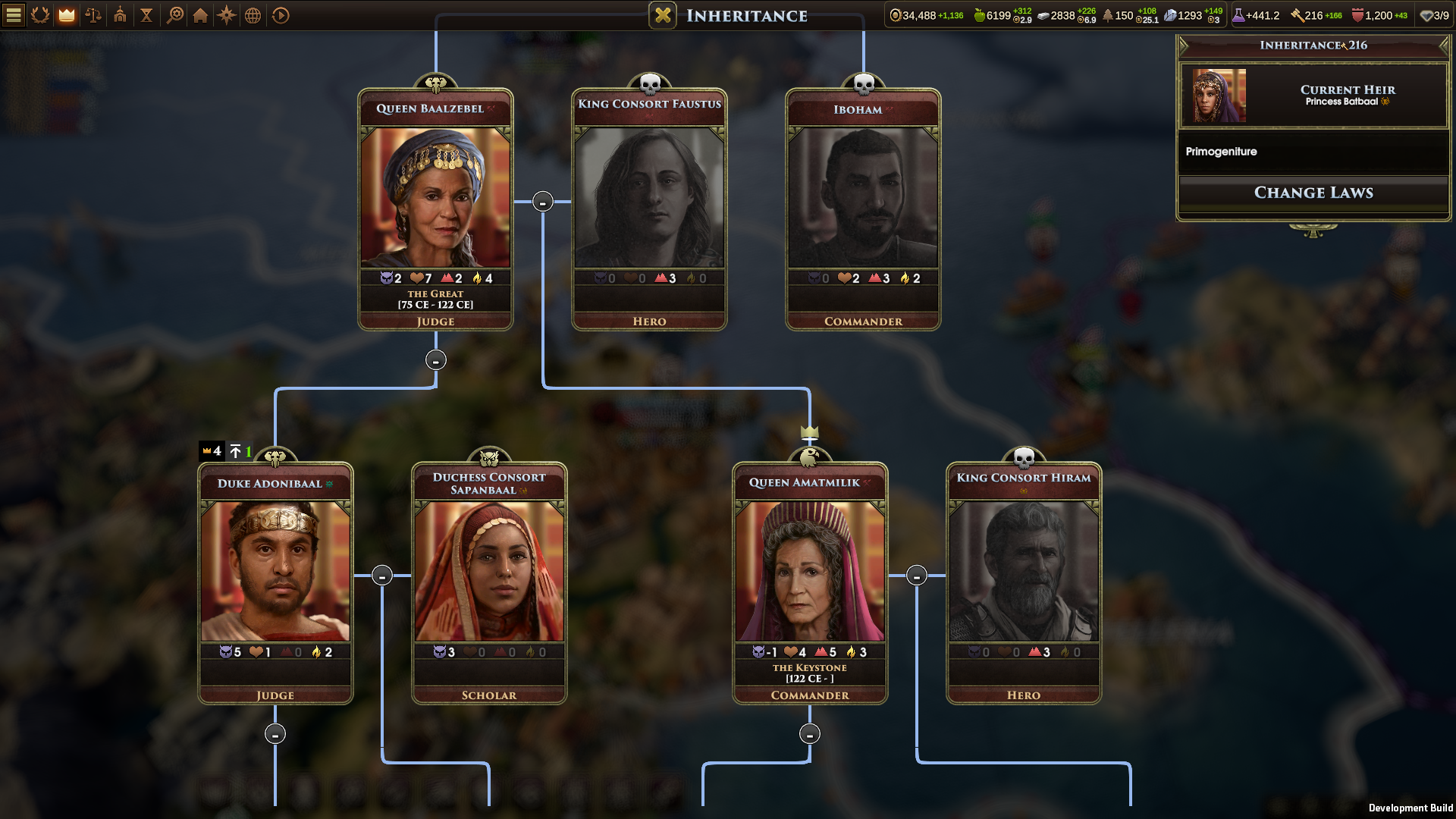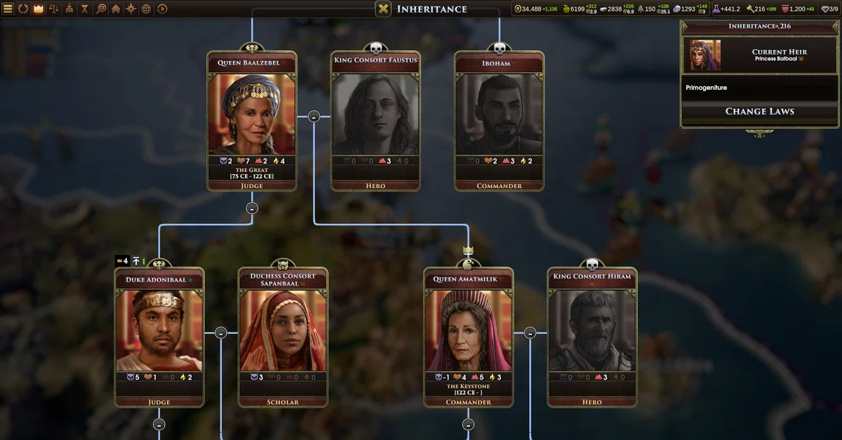 Screenshot of the family tree in the game Old World by Mohawk Games.