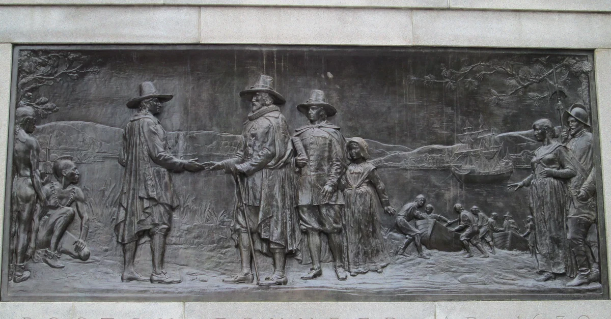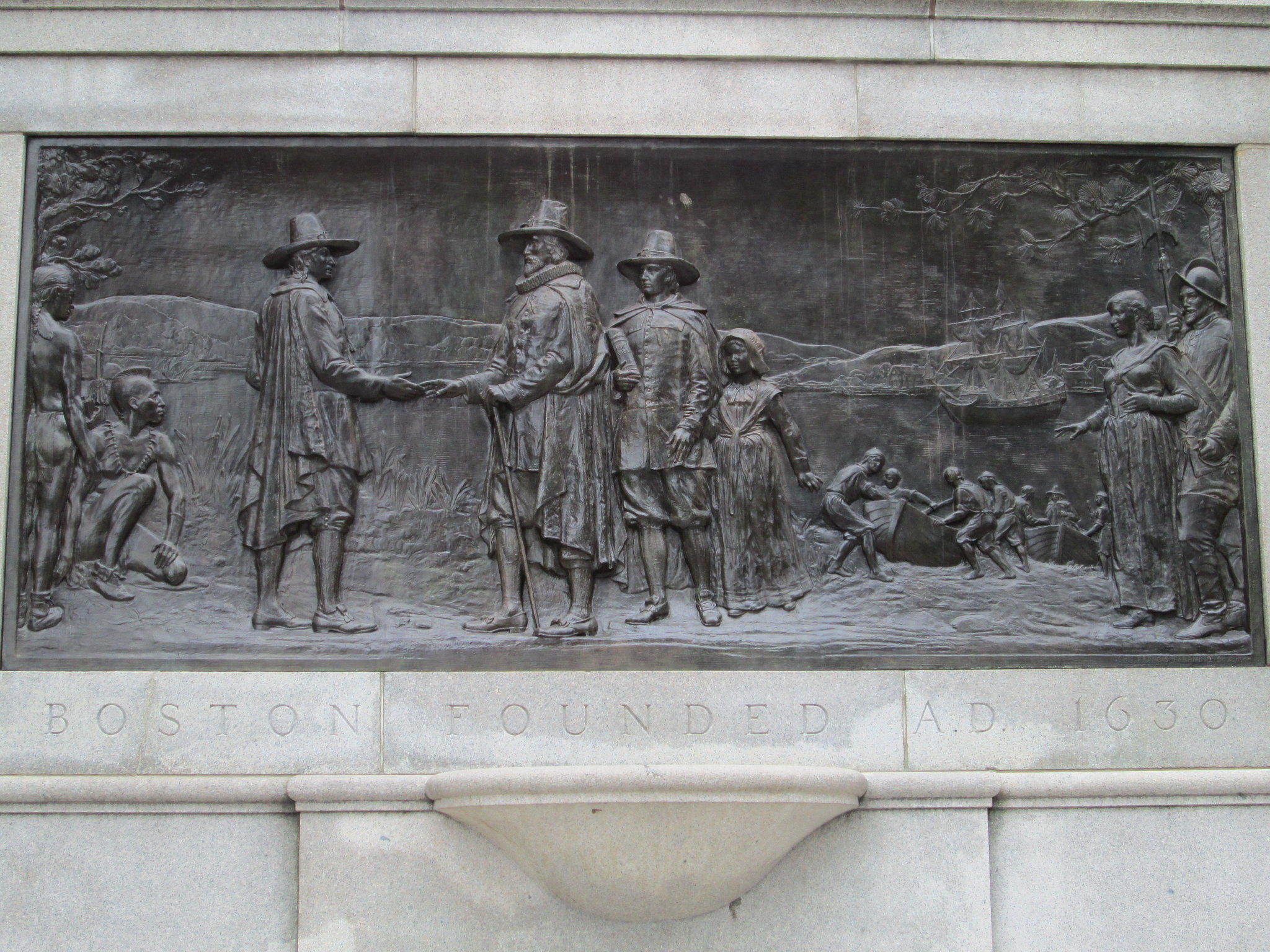 Its bronze bas-relief, sitting in a large frame, shows William Blackstone welcoming John Winthrop's (l. c. 1588-1649 CE) party to Shawmut peninsula, as allegorical figures look on.