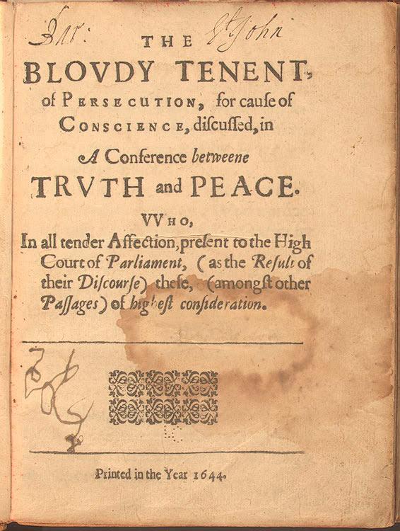 Title page of The Bloody Tenent of Persecution by Roger Williams (1603-1683 CE), 1644 CE.