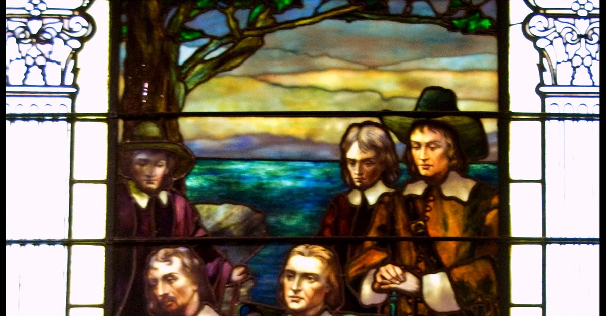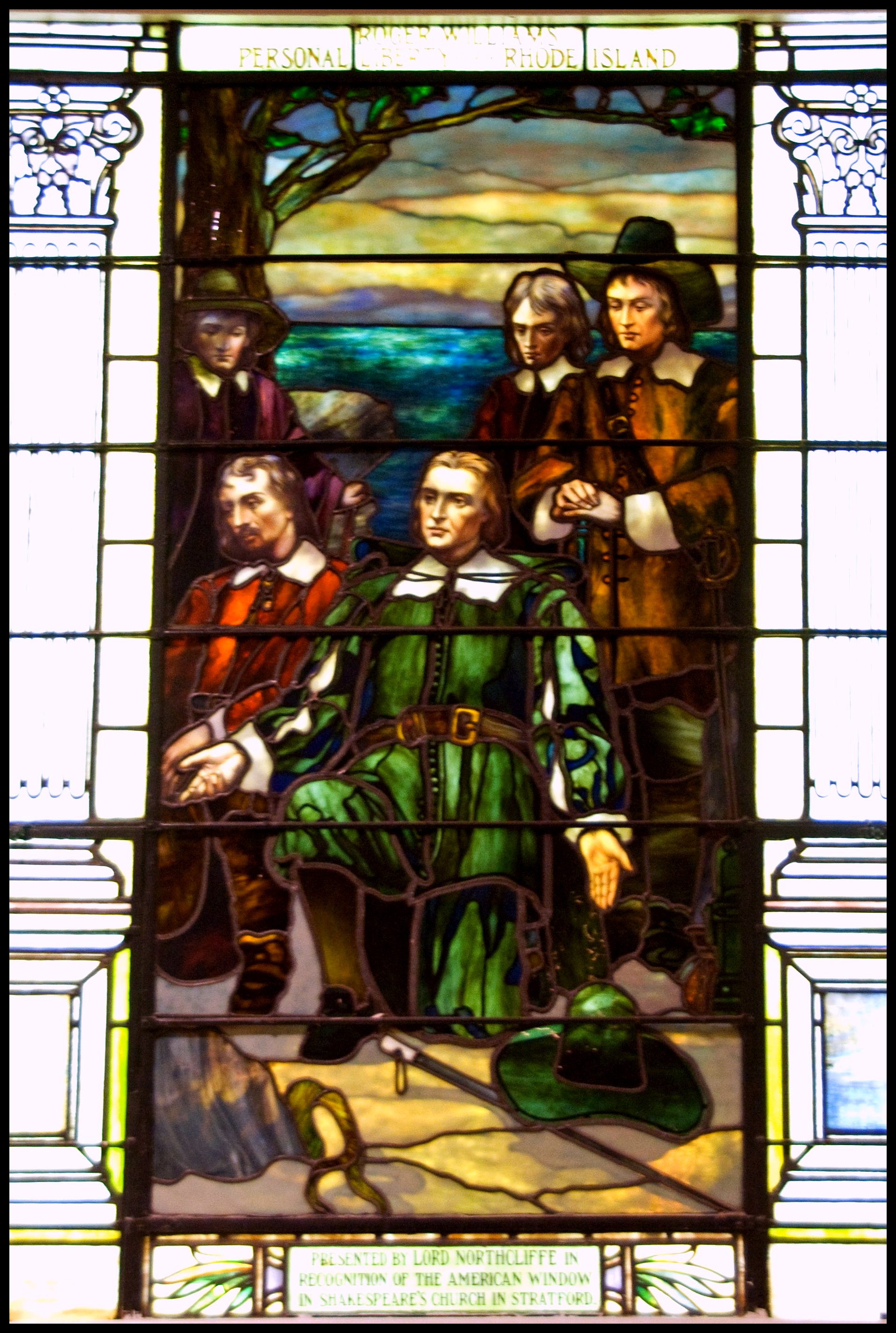 Stained glass depiction of Roger Williams (l. 1603-1683 CE), Plymouth Church of the Pilgrims, Brooklyn, New York City.
